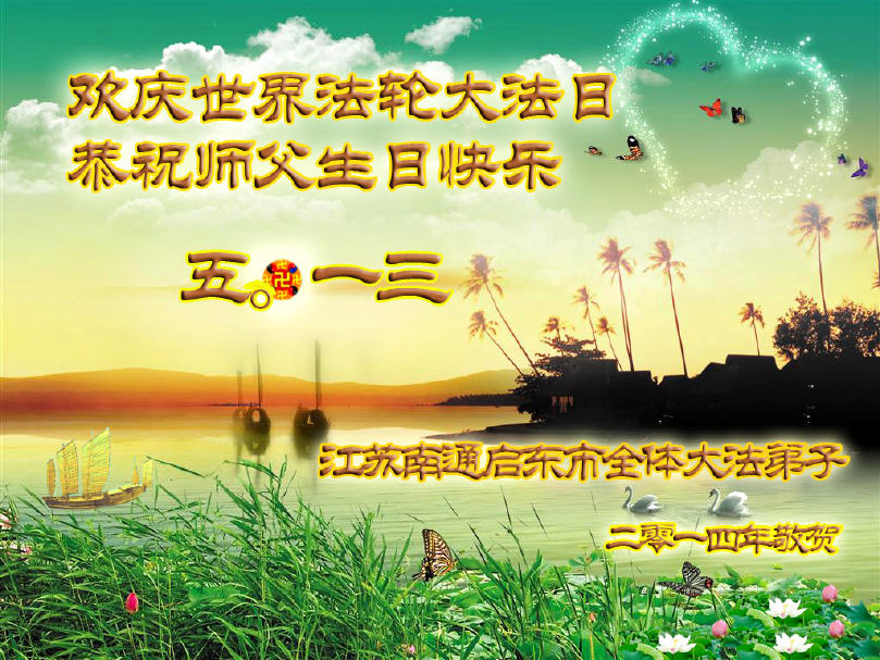 大法洪传誉满球 众生得救齐叩首 江苏南通启东市全体大法弟子欢庆世界法轮大法日!恭祝师父生日快乐!