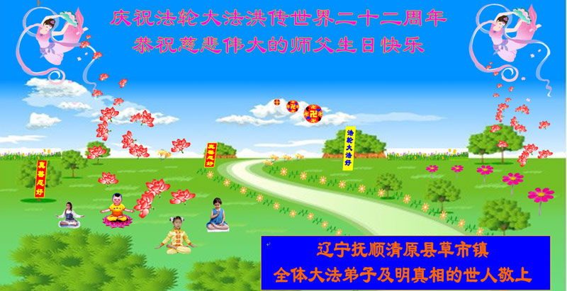 辽宁抚顺清原县草市镇全体大法弟子及明真相世人庆祝法轮大法洪传世界二十二周年!恭祝慈悲伟大的师父生日快乐!