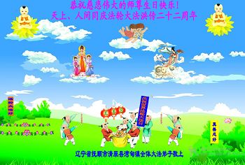 我们感恩师父的救度,修炼法轮大法我们感到无比自豪,我们的家人、亲朋好友、明真相世人都受益于法轮大法,福报实例多的数不胜数。修炼过程中师父为我们付出的太多太多……。浩瀚的师恩无以相报!我们唯一能做的就是修好自己,广传法轮大法的福音!让更多的人都能明白大法真相,得到法轮大法的护佑,更多世人都能在大劫难中平安度过,让慈悲的师尊多一点欣慰! 辽宁省抚顺市清原县湾甸镇全体大法弟子庆祝法轮大法洪传世界二十二周年!恭祝慈悲伟大的师父生日快乐!