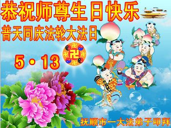 在正法到了最后最后的时刻,迎来了伟大师尊六十三岁生日,和(5.13)世界法轮大法日! 恭祝师尊生日快乐!弟子满怀激动的心情,感谢师尊的慈悲救度与呵护,在最后的一点时间里,修好自己尽最大努力做好三件事,让师父对弟子少一点操心,多一点欣慰。弟子坚决跟师父回家! 辽宁鞍山市大法弟子 二零一四年四月二十三日 辽宁省抚顺一大法弟子恭祝师尊生日快乐!普天同庆法轮大法日!