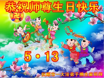 师尊好!师尊辛苦了! 在神圣的“5.13“大法日来临之际,弟子无法用语言表达对师尊的救度之恩,谨在此代表全家五口人跪拜师尊! 辽宁一学法小组的大法弟子恭祝师父生日快乐!