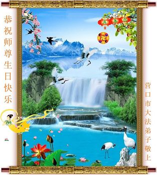 恭祝师父六十三岁生日快乐!祝贺法轮大法洪传二十二周年! 我们作为一名正法时期的大法弟子非常荣幸,所以我们一定要认真学好法实修自己, 多救众生,完成史前大愿,圆满随师还! 鞍山市深沟寺三位大法弟子敬上 二零一四年四月二十六日 辽宁省营口大法弟子恭祝师尊生日快乐!