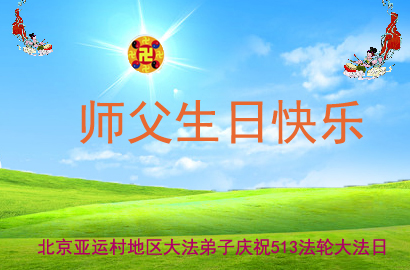 衷心感谢慈悲伟大的师尊,并向师尊叩拜。大法弟子非常想念师尊,并按师尊的教诲精進实修,劝三:退.救世人,走好最后的路! 北京亚运村地区大法弟子恭祝师父生日快乐!庆祝513法轮大法日!