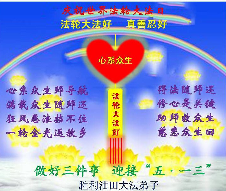 请师尊放心,弟子一定精進实修,圆满随师还! 胜利油田滨南全体大法弟子恭祝慈悲伟大的师尊生日快乐!普天同庆五一三世界法轮大法日!