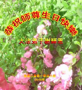 请师父放心我们会在正法最后时期做的更好,在证实法、救度众生的过程中用大法归正我们的一思一念,一言一行。让我们的小花开的更加灿烂。 河南濮阳中原油田一资料点 二零一四年四月二日 河南濮阳油田一学法点大法弟子祝慈悲伟大的师父生日快乐!祝贺法轮大法日!