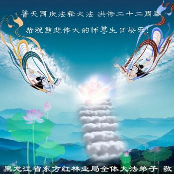 黑龙江省东方红林业局全体大法弟子恭祝慈悲伟大的师尊生日快乐!普天同庆法轮大法洪传二十二周年!