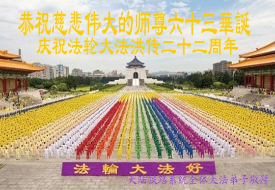 大陆铁路系统全体大法弟子恭祝慈悲伟大的师尊六十三华诞暨法轮大法洪传二十二周年!