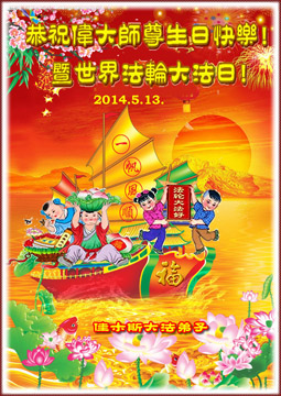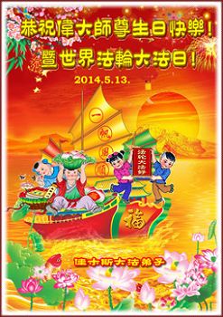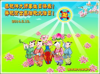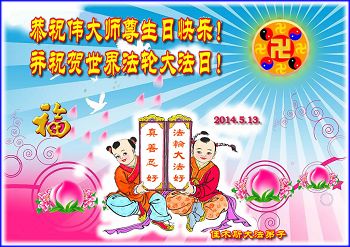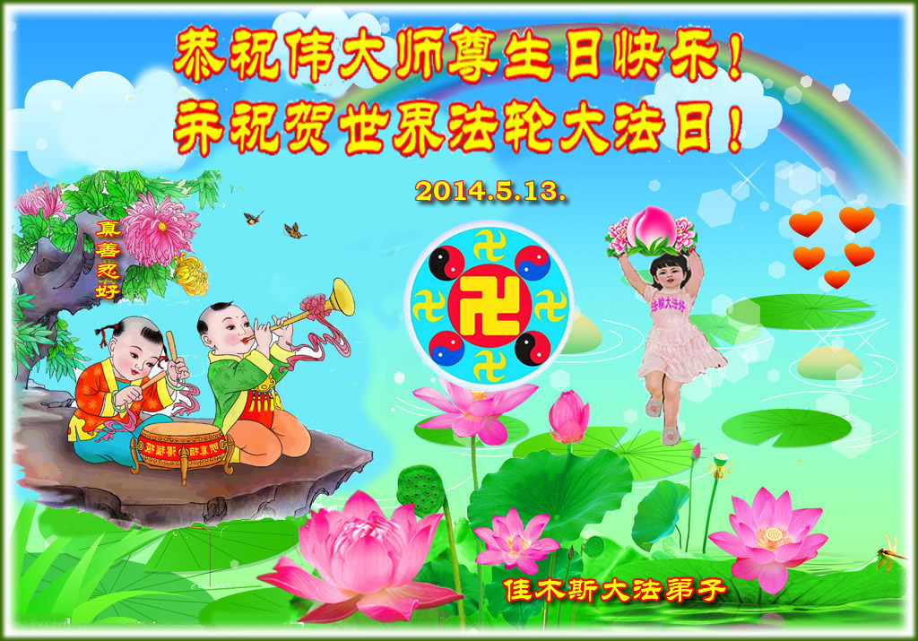 人神欢庆五一三, 佛恩浩荡大无边。 大法洪传二二年, 真理洒遍满人间。 法中熔炼添正念, 大法弟子真相传。 三:退.保命躲灾难, 众生得救笑开颜。 道德回升人向善, 大法美好人神赞。 恭祝师尊永快乐, 叩首感恩永无限。 佳木斯大法弟子 2014. 5.13。 黑龙江省佳木斯大法弟子恭祝伟大师尊生日快乐!