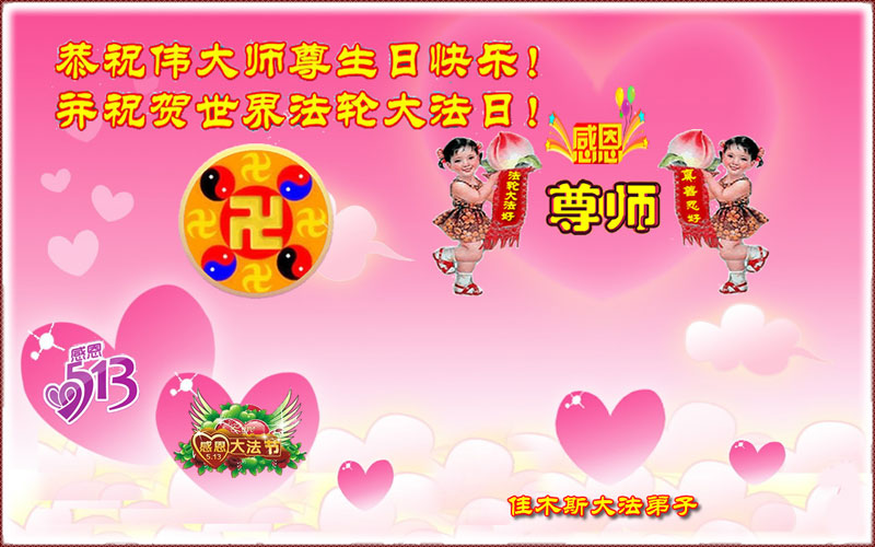 我们深知师父为我们承受的太多太多,无法用语言言表,我们只有做好师尊要求的三件事,多救人,回报师恩。谢谢师尊慈悲苦度! 黑龙江省佳木斯一学法小组全体大法弟子恭祝慈悲伟大的师尊生日快乐!