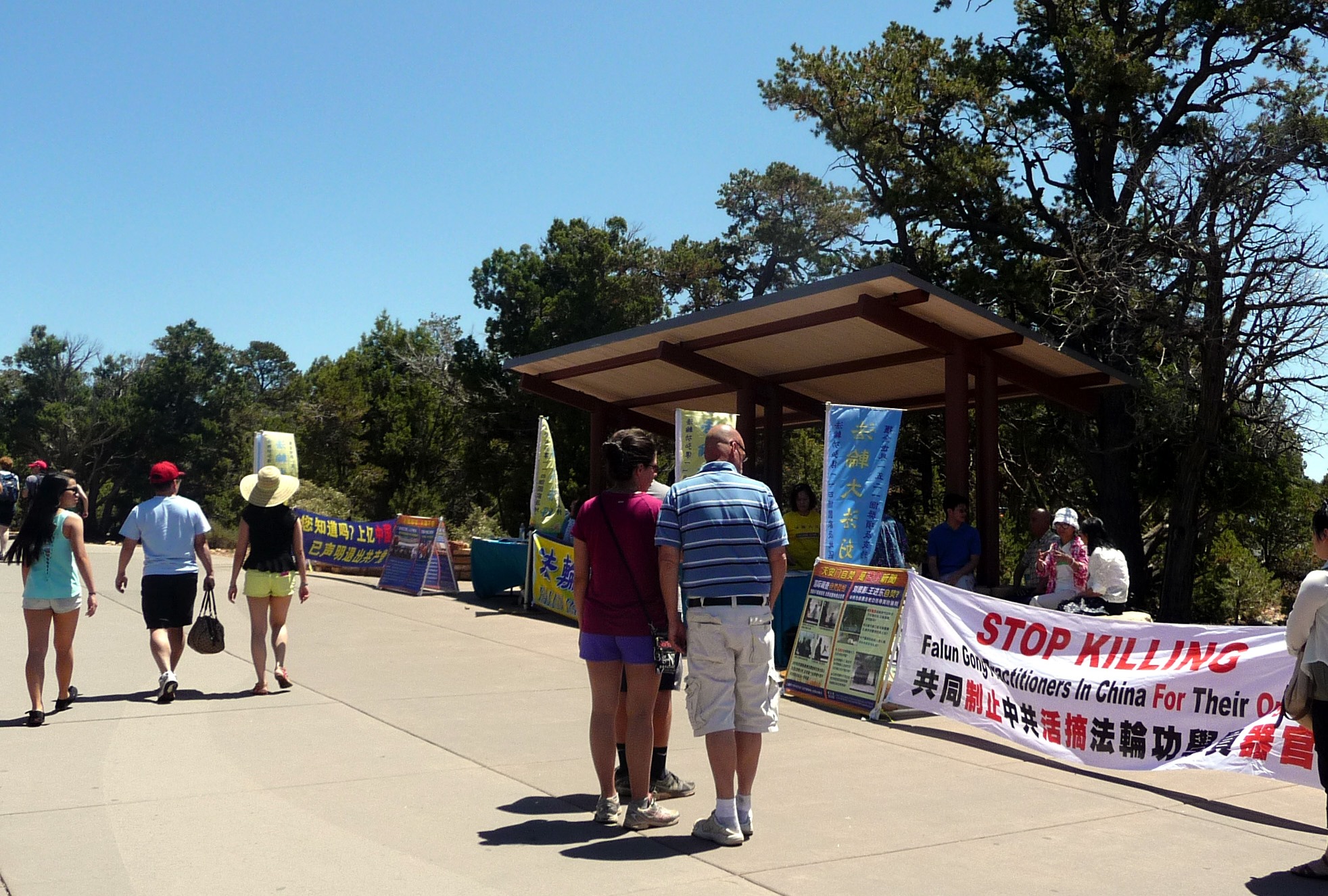 一位来自日本的老先生,看了“法轮大法好”的横幅,用英语向学员说:“我太惊讶了!你们来这里讲真相,路途遥远啊!我了解你们在中国受的迫害!” 另有一对来健行的美国夫妇,在展板前看了图片表示:“我旅行过很多地方,到处都有你们的义工解说真相。这次我要真的了解一下法轮功了!请给我传单和资料,我要回家仔细看看。” 住在美国德州的一对越南夫妇带着父母及孩子来旅游,看到学员穿着黄色上衣,就走过来说:“共产邪*党-太邪恶了,活摘人体器官,实在太残忍了。我支持你们,就是要让更多人知道的!” 七日清晨,有多个来自大陆的旅游团到此旅游,他们看到真相横幅时,不少人流露震惊的表情。有的人还叫出声来:快来看,美国有法轮功!有一位中国妇女一直在景点徘徊,后来,她找到学员做了三:退.,并说:“要把握机会做三:退.嘛!” 一位来自大陆的吴姓学生,当学员问他三:退.了吗?他很高兴地答道:“我在国内就知道用翻墙软件,看一些大.纪.元;、新!唐!人:。我在洛杉矶就做了三:退.。我知道三:退.保平安。”另一位来自安徽的同伴也说:国内工作太艰难了,走后门,送红包,我们老百姓哪负担的起啊!哪个贪官不是赶快想办法出国啊!”一旁站着的一对中国中年夫妇也微笑点头说:“是呀,是呀!出国了好多因为封网不知道的事,现在都知道了,法轮功在外国是可以炼的。” 有两位美国年轻人走过停下来,用中文讲:我们到中国教英文两年,法轮功是不能讲的,我不知道怎么回事?后来到台湾去,到处都有法轮功,就知道你们受到迫害的真相。我知道法轮功是好的,请告诉我如何上网找资料,我要学一学。