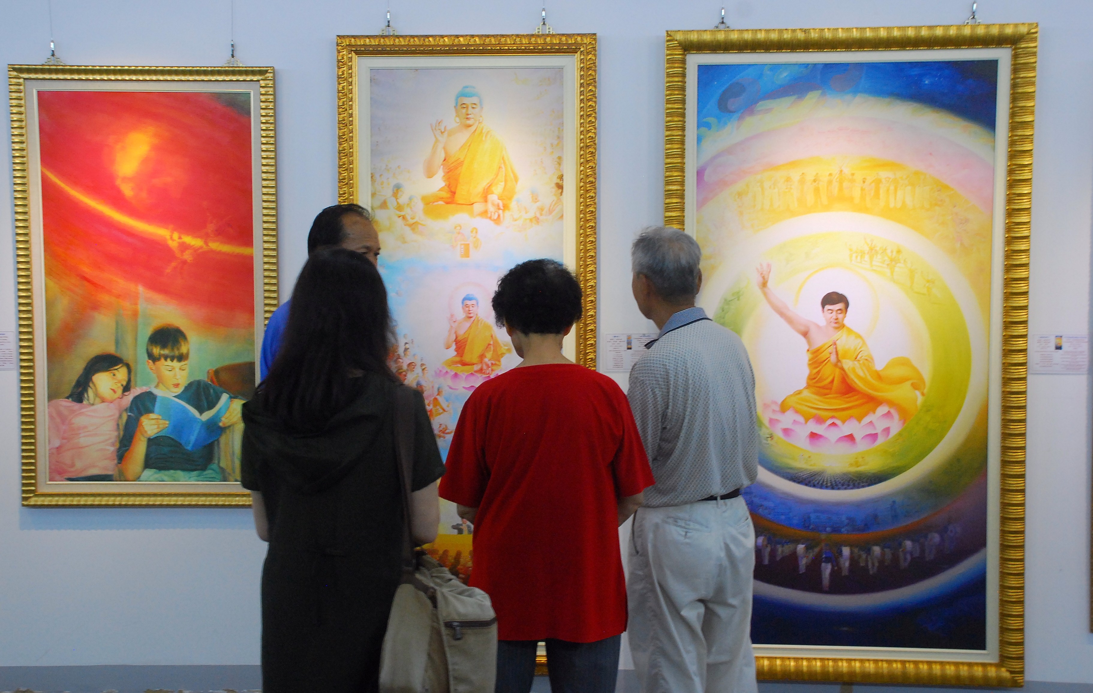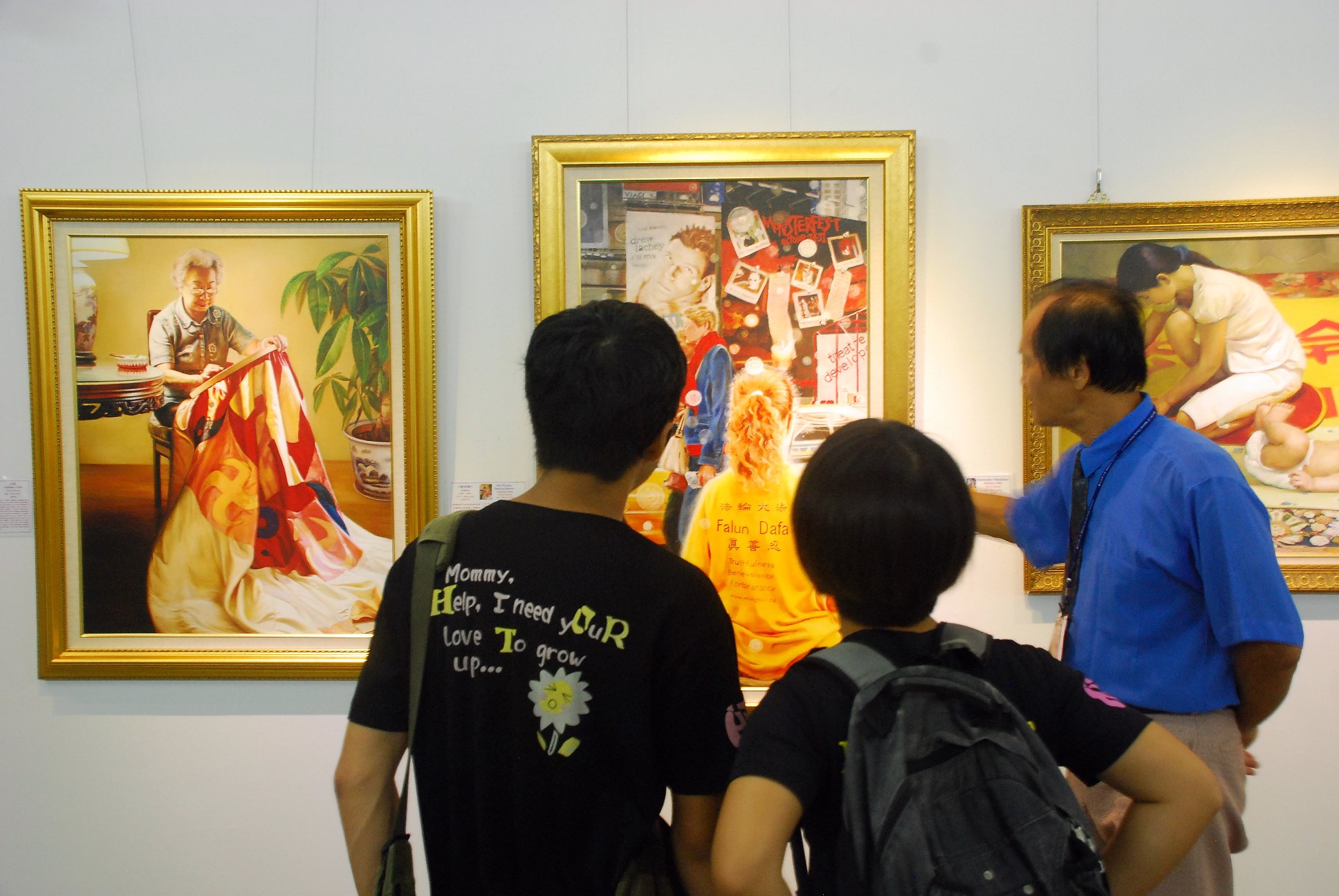 应用化学系的陈姓同学站在《孤儿泪》画作前说:“画中的小孩用非常真挚的眼神看着我们,好象要告诉我们什么事情,我觉得这幅画让世人了解了中共迫害法轮功的真相。” 画展展出三十多幅画作,其中包括“同化大法”、“返本归真”、“传播真相 呼唤正义”等。导览人员表示,这些作品是由一群来自不同背景的艺术家创作的。他们因为修炼法轮大法,得到身心的健康、精神的升华,领悟宇宙人生的真谛,把自己对人生的领悟、亲身的经历,以及在这群同化真善忍的人们身上所发生的事情通过艺术作品展示出来。 导览人员说,法轮大法是李洪志先生于一九九二年传出的佛家上乘修炼大法,修炼“真善忍”,强调重德修善,却在大陆受到中共的残酷迫害。 导览人员还表示,有一位回台的美国留学生参观了美展,当他看到“活摘器官”这幅画时,不停地流眼泪,导览人员向他讲述了法轮功在大陆被迫害,中共摘取法轮功学员器官变卖图利,这位留学生惊讶地说:“现在世界上还有这种不人道的事情发生,实在不可思议。” 导览人员还向他介绍画作“震撼”说:“法轮大法修炼者的神情是那么端庄、慈悲,一个艺术家本身没有那种修为,不可能画出这种神态来。你看她在打坐还被扣着脚镣,虽然被五个恶警迫害,她内心还是坦然不动,纯净中忽然腾空,震惊了恶警。神迹通常会在修炼者慈悲、坚定、圣洁的状态中出现。” 一位工艺系的同学留连展场,他感动地说:“这些画都画得很真实,看了这些画觉得有升华感觉。这幅眼睛画得很传神,是要告诉西方人中共迫害法轮功。中共迫害修炼人,很残忍啊,我觉得画里面传达了善恶有报的真理。” 第一次看到这个画展的一位园艺系学生说:“作品感觉很祥和,让我知道原来法轮功是这样被迫害的,我们应该把真相说出来。” 有一家人刚好从北部回南部家乡,偶然的机会来到画展现场。参观了画作后,一位女士指着《活摘器官》画作表示,活摘器官在大陆还存在:“很残忍,听说有人去那里住院,在自己不知道的情况下,被打麻药,醒来时发现身上少了什么器官了。中国大陆是无神论的地方,不让人民有信仰的自由,大陆很多的资讯都被封锁了。” 一位嘉大职员看到反映酷刑的画作觉得迫害很恐怖。他特别为“纯真的呼唤”这幅画所感动,指着画里的小女孩说:“这位小女孩皱着眉头,从她的眼神、汗水,还有她的泪水,我看到她内心无言的抗议。小女孩在自由民主的国家,纽约曼哈顿的街头,在雨中久久站着,她所表现出来的眼神让我非常感动。” 一位导览人员为两位生物系的学生详细解说画作,他指着一幅题为“净莲”的作品说:“莲花出污泥而不染,画中这位少女穿着洁白的衣服,象征纯净,腹前有一个法轮标志,是炼法轮功神通加持法,呈现出慈悲祥和,透过打坐能了解静中内涵,达到心灵平静。” 参观画展的学生在导览人员解说下欣赏作品时,眼神专注地看着画面,参观后都表示感受到祥和、平静的气氛。一位学生看了这些画作后,感受到法轮功的神圣,他望着“佛像”这幅画说:“我好象走进了神佛的世界。”