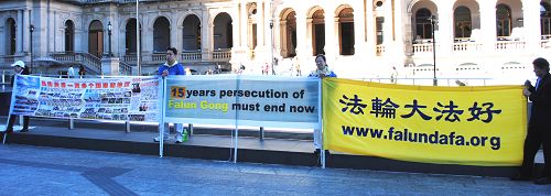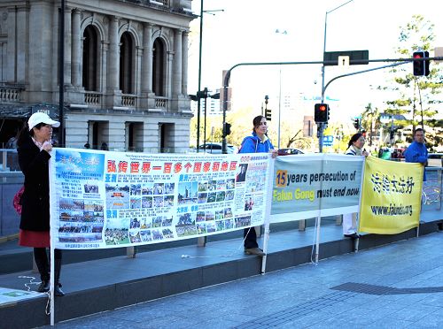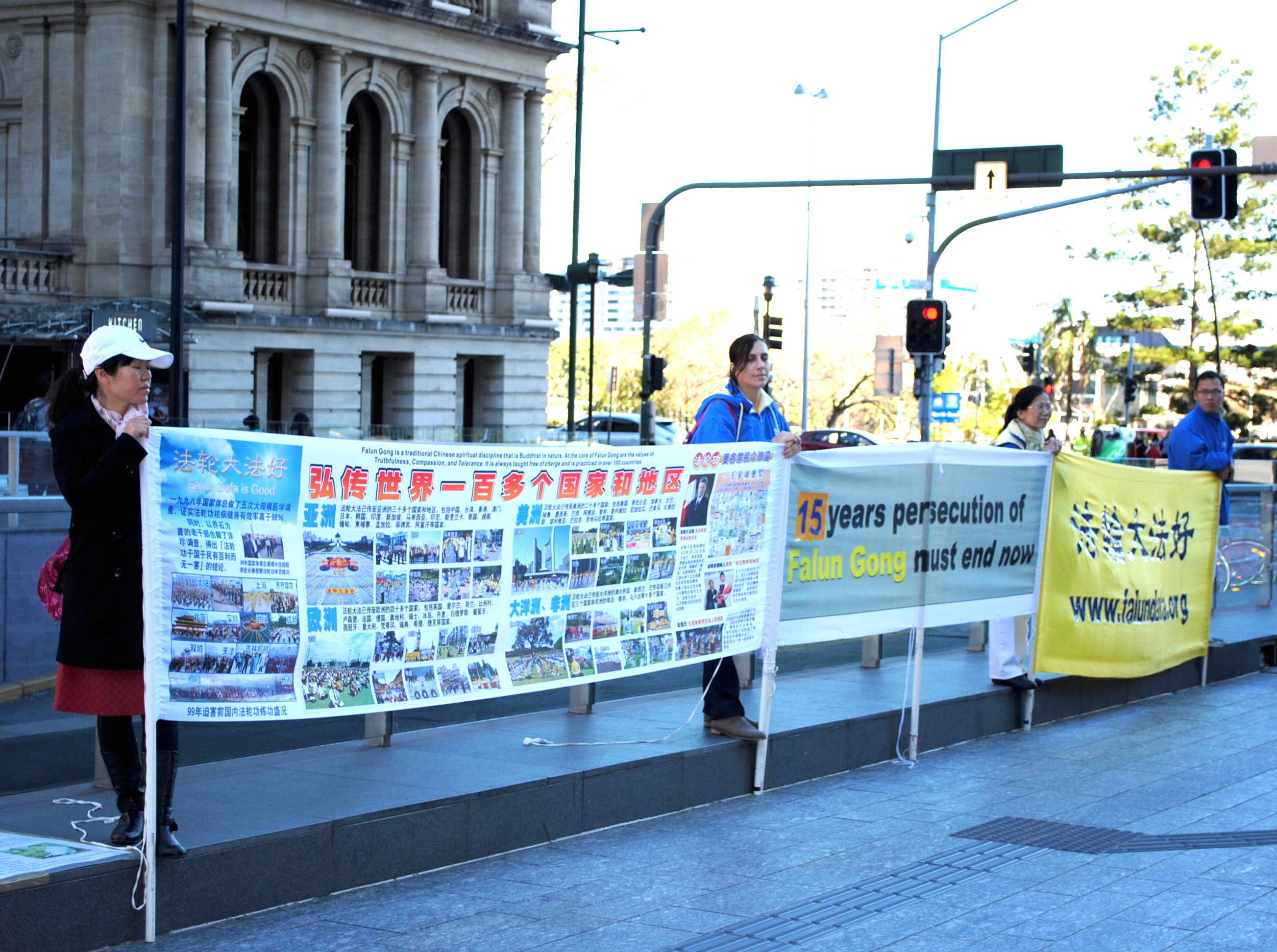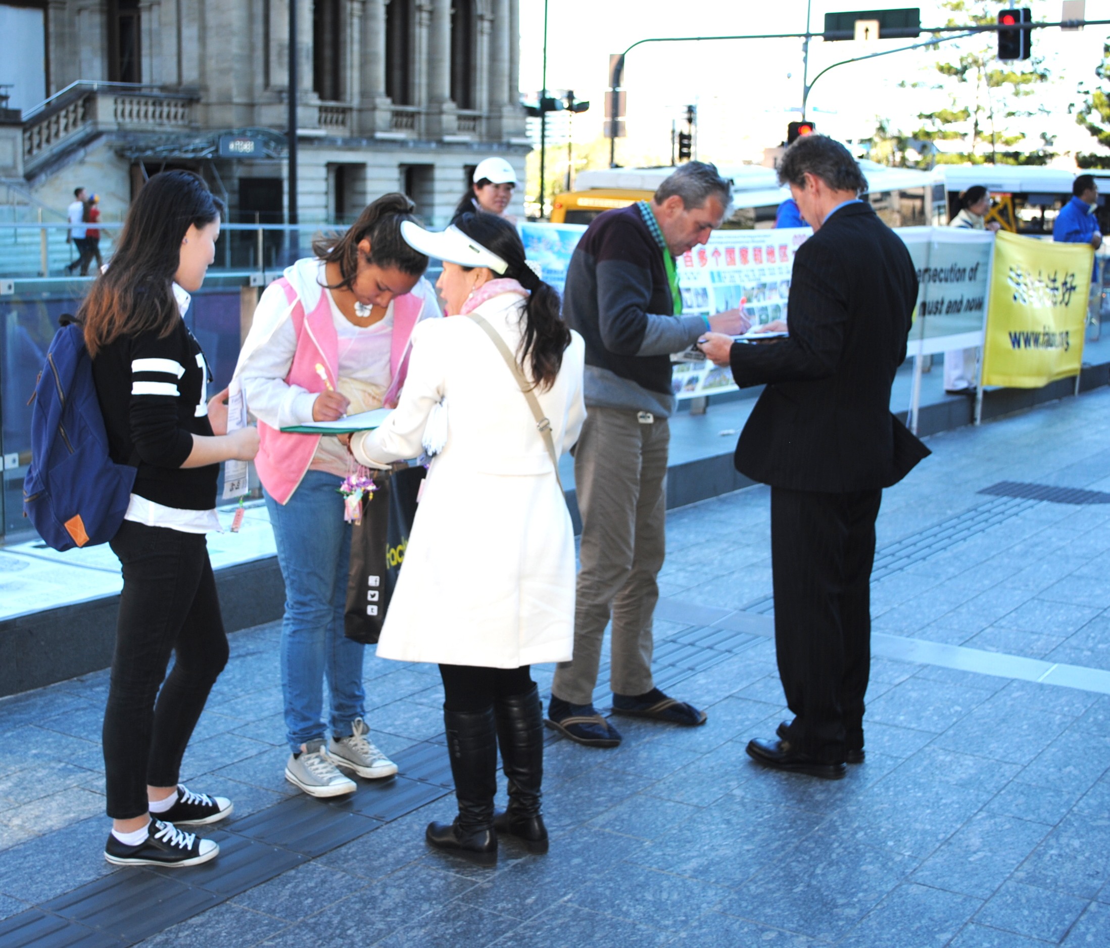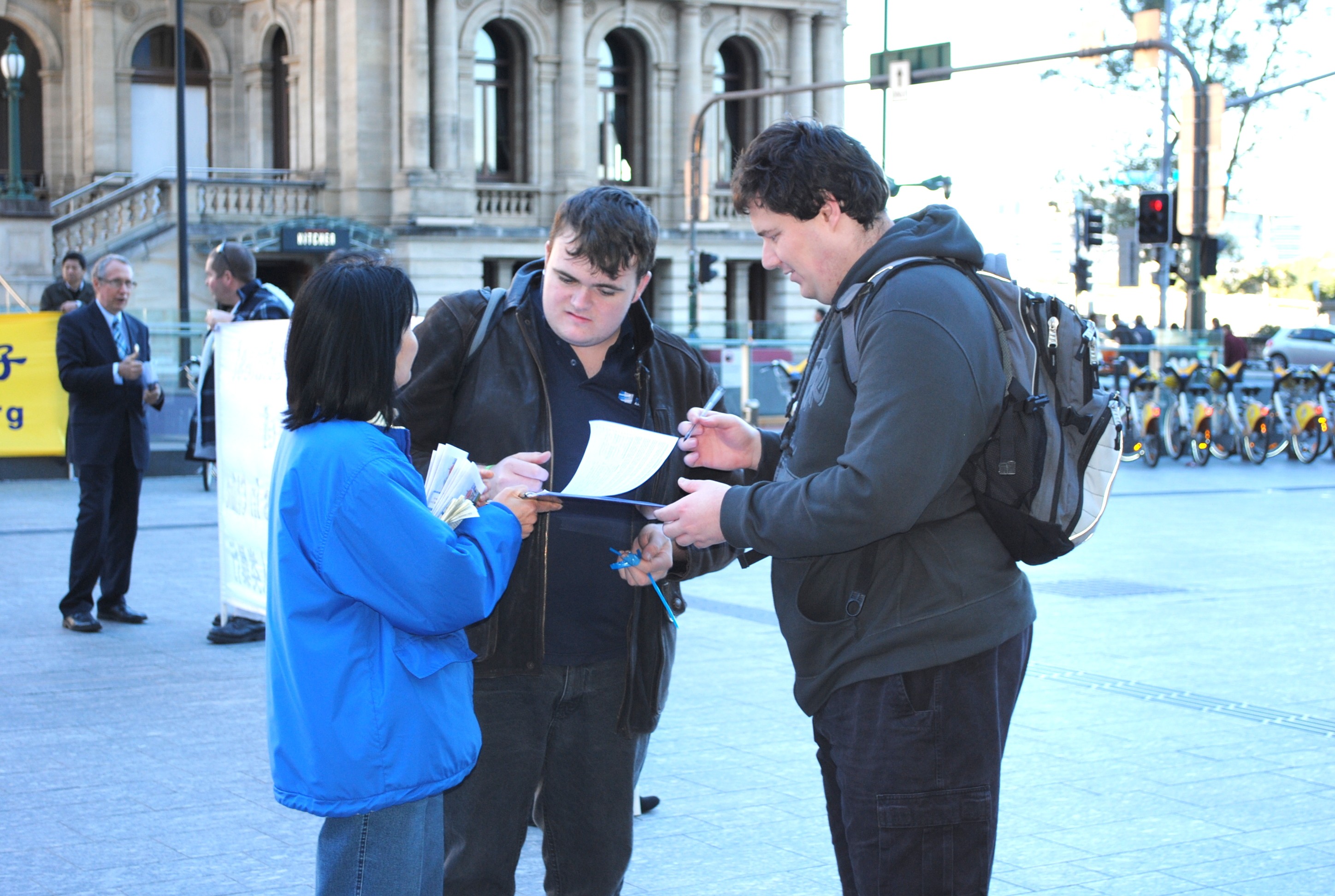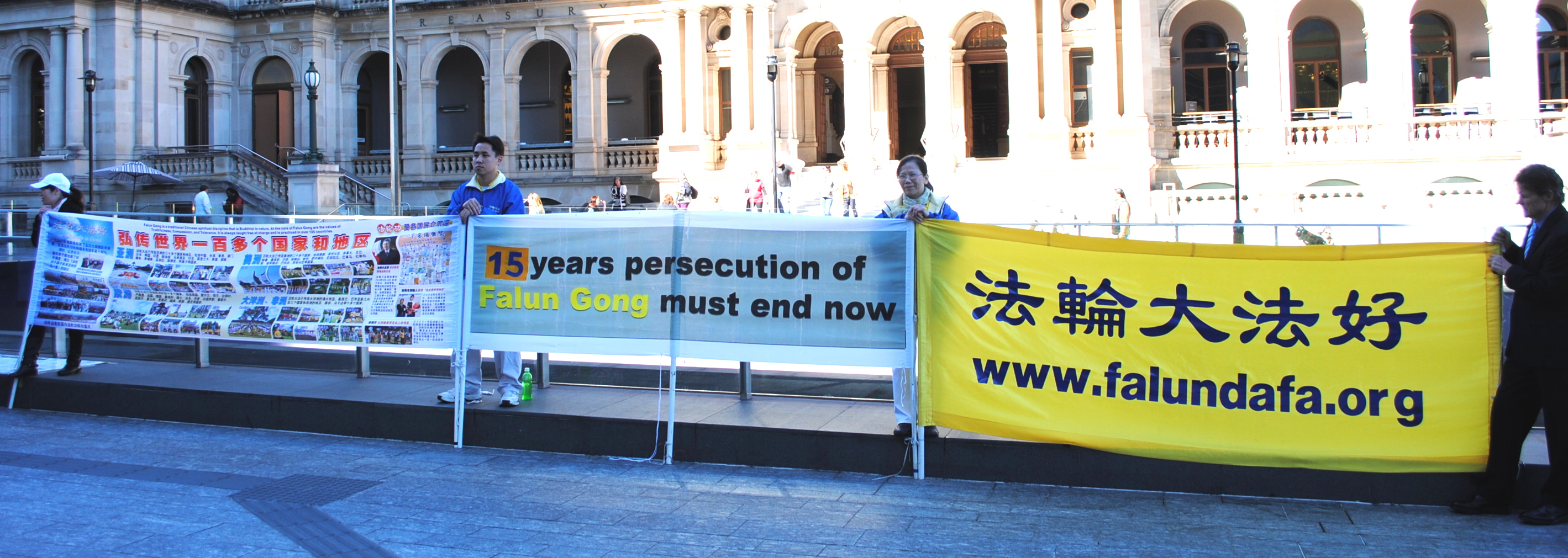 为了让澳洲人民了解法轮功学员在中国所遭受的残酷迫害,当地学员在分别在布里斯本中领馆前举行烛光夜悼,以及在布里斯本广场(Brisbane Square)展示法轮功真相横幅和展板。无论是在市中心忙碌的上班族,还是来澳游玩的旅人,他们都被中共残忍的酷刑手段和活摘器官黑幕所震惊。 中西方民众:迫害邪恶至极 澳洲青年安得烈(Andrew)路过布里斯本广场,看到排列一幅幅的酷刑图片,他沉默了。在仔细看完每一副展板后,他说:“我看不出任何他们应该被迫害的理由,这绝对是错误的事。酷刑图片看起来邪恶至极,这样折磨人民的做法超乎我的想象。” 另一名澳洲男子路易斯·寇瑞特和学员交谈了许久后表示:“我认为必须要有所改变,我相信只是静坐和寻求心灵平静的人是不应该被迫害的。”“他们(学员)没有做错任何事,不应该没理由的受伤害。”寇瑞特也希望澳洲政府立法打击中共活摘器官的非法交易。 一位来自中国大陆的老华侨,在看到中共迫害法轮功的真相后同样震惊,他连呼:太邪恶,太邪恶了。同时他相信很多人由于不了解中共的本质,才会被其蒙骗,他呼吁中国人多了解真实、自由的信息。 活动中,许多素不谋面的人对法轮功非常同情,他们一一在征签版上签名支持,还表示要多带一些法轮功传单回去发给他们的中国朋友。 风雨十五年 清华高材生历冤狱四年 揭露中共罪恶 一九九九年一月在中国开始修炼法轮功的大卫(David)原本是清华大学的高材生,开始修炼没几个月就面临中共铺天盖地的全面镇压,紧接着他也因为替法轮功说公道话而被非法判刑四年,在狱中遭受过各种酷刑折磨。如今来到澳洲,尽自己所能在这片自由的土地上揭露中共的罪恶。 回忆起迫害初期,大卫说:“第一个感觉是很震惊,感觉肯定是政府错了,当时我们就不断地去上访,我也给政府写了一封万言书。我先后到了中办、国办、信访办,还去了天安门等等去上访。九九年七二零刚刚发生的那几天,全国各地很多学员都到了北京中南海,大家只有一个心愿,要为大法说一句公道话,因为我们所有修过大法的人都从中受益,身心健康,家庭和睦。” “当这个迫害发生之后,政府造了这么多谣言,作为一个法轮功学员也在反思法轮功究竟是什么,我的道路究竟对还是不对,通过自己对大法这种理性的认识、升华和受益,我切切实实感到大法是正的,我们做的没有错。但迫害发生了,在这个社会都被蒙骗的时候,我们法轮功学员更应该作为中流砥柱站出来坚守这个社会的道义和良知,让大众都能知道真相,正因为这种信念,我就一直坚持到现在。经过了十五年,正义的力量越来越强大。” “只要中共一天不停止迫害,法轮功学员讲清真相、揭露迫害的事一天也不会停止,我们会做到中共停止迫害的那一天。” 澳洲学员反迫害 议员流泪支持 十五年前当中共突然一声令下开始无理迫害法轮功时,身在澳洲的学员又是如何面对的呢? 一九九六年就开始修炼的南昆大学文学院中文讲师赵女士回想当年的情景,她说:“当时我们就感觉到非常震惊,因为这么好的一个功法,这么多人身心受益很大,在中国有近一亿人修炼。所以当时我们听到迫害的消息时感到是非常错误的。中共在电视、报纸上全部都是负面的,我们知道那不是事实,我们就觉得我们有责任在这个关键的时刻把真相告诉大家,让大家一起来制止这场迫害。” “刚开始我们也不知道该怎么做,我就到我们当地议员的办公室,我就跟他讲在中国迫害的情况,让他通过外交部向中共提出抗议,当时他眼泪都快流出来了,说:‘我们不知道这个情况,谢谢你告诉我,我今天下午就打电话告诉外交部长,让他关注这件事情。’当时我们跟民众讲这个事情,他们都是非常支持的,都不理解为何要迫害这些有信仰的人。” 十五年来,赵女士和其他法轮功学员一样都不间断地在为人权而奔波。“多年来,我们一方面向政府讲真相,一方面举行各式各样的活动,全面的向人们讲清真相。我们曾经绝食抗议、参加SOS紧急营救活动,长途跋涉走了很多很多路告诉世人。不觉得累,就感觉是一种发自内心的责任,多一个人知道真相,就减少一个对中国法轮功学员的迫害。这么多年走过来,很高兴看到越来越多的政府、民众都知道了这个情况,而且现在有一亿多的中国民众都退出中共的相关组织,这都是民众觉醒的一个迹象。我们对政治没有任何诉求,就是希望通过讲真相来停止这场迫害。每个人都应该有信仰自由,特别是法轮功,教人向善,宣扬的都是中国传统文化,这些东西都是非常珍贵的,我们做这件事情不只是给法轮功学员一个公道,而是站起来维护人类一些最基本的道德观念和普世价值。” 西人法轮功学员道伊(John Dowie)也表示,当年从收音机里传来中共迫害的消息和其所编造出的谣言,他感到不可思议,他说:“当时我就想,这么美好的功法,没人向我要过一毛钱,对公众完全是义务教功,我简直不敢相信,他们怎么可以迫害如此好的功法,我当时震惊得不得了。” 十五年过去了,迫害仍在继续,道伊也呼吁人们:“我们需要持续对中共施压,停止这场骇人惊闻的迫害,我呼吁所有人去找自己当地的政要、亲朋好友、各界领袖,让更多的人都来关注这场迫害。”