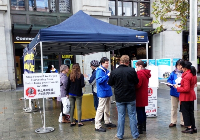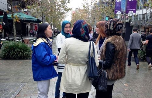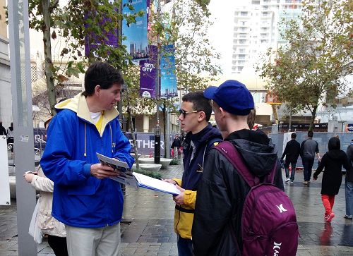 “告诉人们,你们需要的只是一个签名” Katie Quinn 是一名热心慈善和公益的传统女性,她表示以前没有听说过法轮功,更不知道还有活摘器官这样可怕的事情。她了解真相后签了名,并接着给征签的法轮功学员提了一个建议。她说:“你们要把这个征签的场地布置的更有效,更好的与路过的公众沟通。现在的人对慈善事业都带着一种疲劳感,因为社会上各种慈善组织很多,而且绝大多数是需要人们捐钱的。所以你们一定要让人们知道:你们在这里不要任何人一分钱,也不需要占用他们多长时间,只是要他们一个签名。你们一定要在视觉上直接把这个信息传递给过往的人们,我相信签名的人会多很多。” 无独有偶,Alex Hedley本来已经走过去了,五分钟之后他又折回来了,他签了名之后紧接着告诉征签的法轮功学员说:“其实我对法轮功的真相已经非常了解,本来已经走过去了,想到要提醒你们一下如何让更多人来签名,又回来了。你们需要改善这个场地与过往公众沟通的信息。把这样一个信息打出去:您的签名可以挽救生命(Your signature can save a life),人们就都会来签。” 年轻人争相签名 当日很多年轻人明真相后争相签名。Shaina Edmandson和同伴购物路过,停下来签名,征签的学员问她以前是否听说过活摘器官的事,她表示从新闻上看到过。她的一名同伴Annika Sharpe问学员到底怎么回事,她抢着回答他说:“正常情况下,比如在澳洲,人们要做器官移植的话,就要排队等候相匹配的器官,通常需要等待很长的时间。但在中国他们按照需要提供器官,通过杀人,只要需要就可以提供。”同伴Annika Sharpe和Kyrahzia Bruknell听着瞪大了眼睛,接着签了名。 Bella Bateman 说她在家中听到妈妈说这件事,就认真读了妈妈拿回去的真相资料,“今天看到你们当然就要签名了。”她的同伴 Alyssa Hutchison 也签了。 Rebecca Holder 和 Daniel Brand 说他们没有听说过法轮功,也不知道活摘器官的事情,想知道怎么回事。一名法轮功学员给他们讲了近半个小时,两人签了名,拿了真相资料,再三致谢后走了。 华人明真相纷纷三:退. 王先生来自河南,已经在西澳定居三十多年,他表示对活摘器官的事了解很多,也已经在多个地方签过名支持停止这一罪行。但他仍然认为法轮功有政治动机,征签学员给他详细讲了迫害发生前法轮功在中国洪传的盛况,以及当时法轮功在中国社会包括在中南海的良好影响,并告诉他自己作为一名软件工程师为什么会常常走上街头讲真相的真实原因。王先生听完后笑了,拍拍学员的肩膀说,“你很好,谢谢!” 当天过往的华人停下来听真相的人也很多,有近二十人选择了三:退.。