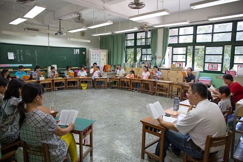 下午全体学员在校园中庭,有十位同修分享他们在参与各个证实法的项目中,去执着、证实法、讲真相等修炼心得体会,激励在场的学员更坚定实修。  二零一四年八月二十四日在高雄市新甲国小举办学法交流,数百名学员参加,下午在校园中庭有十位同修分享他们在参与各个证实法的项目中的修炼心得体会。 |