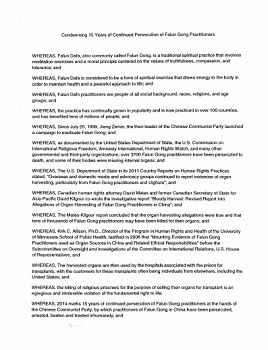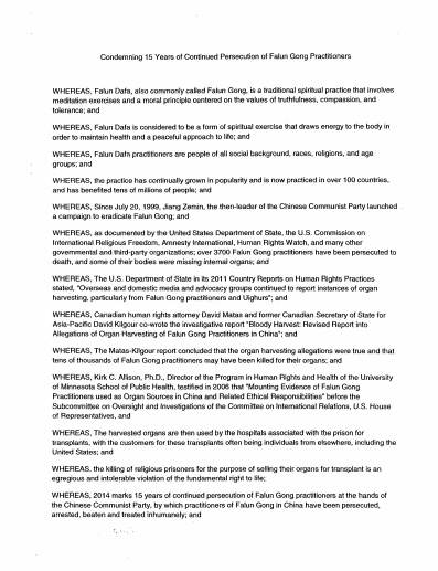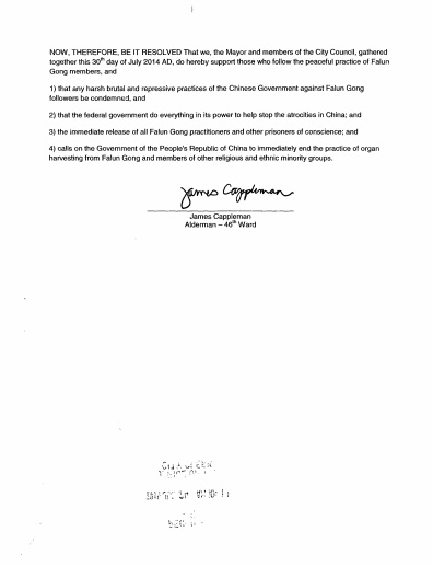 | 【明慧网二零一四年九月二日】二零一四年七月三十日,美国芝加哥市议会通过R2014-627号决议案,要求中共“立即释放所有法轮功学员和其他良心犯”,并“立即停止从法轮功学员和其他宗教与少数族裔团体成员身上获取器官”,呼吁“(美国)联邦政府应采取一切力所能及的措施帮助制止在中国的暴行”。 该决议案由芝加哥市第四十六区区长凯普曼(James Cappleman)发起,七月三十日在市议会上全票通过。 美国芝加哥市议会通过的R2014-627号决议案决议案译文如下: 鉴于,法轮大法(又称法轮功)是一种传统的修炼方法,包括了功法和以真善忍为核心的道德原则;以及 鉴于,法轮大法被认为是一种能吸收能量至体内,以保持身体健康和平和生活态度的功法;以及 鉴于,法轮大法修炼者来自于各个社会阶层、种族、宗教信仰和年龄群;以及 鉴于,该功法受到越来越多人的欢迎,目前有一百多个国家的人在修炼法轮功,它已使数千万人受益;以及 鉴于,自一九九九年七月二十日,前中国共产党党魁江泽民发起政治运动要铲除法轮功;以及 鉴于,根据美国国务院、美国国际宗教自由委员会、大赦国际、人权观察组织等众多政府机构和第三方机构的文件,至今已有三千七百多名法轮功学员被迫害致死,其中有些尸体器官丢失;以及 鉴于,美国国务院在二零一一年《国别人权报告》中指出,“海外和国内媒体以及倡议团体持续报导活摘器官事件,特别是从法轮功学员和维吾尔人身上(活摘器官的事件)”;以及 鉴于,加拿大人权律师大卫•麦塔斯(David Matas)和前加拿大亚太司司长大卫•乔高(David Kilgour)合写的调查报告《血腥的活摘器官:调查中共摘取法轮功学员器官指控的报告》;以及 鉴于,麦塔斯和乔高的报告总结道,活摘器官的指控是真实的,可能已有数以万计的法轮功学员因他们的器官而被杀害;以及 鉴于,柯克•艾利森(Kirk C. Allison)博士,明尼苏达大学公共卫生学院人权和健康项目主任,二零零六年在美国众议院国际关系委员会下属外交政策监督和调查委员会前证实说,“越来越多的证据显示在中国法轮功学员被用作器官来源以及相关道德责任问题”;以及 鉴于,这些获取的器官后被与监狱有关系的医院用在器官移植手术中,这些接受器官移植的病人往往来自其它地区,包括美国; 鉴于,杀害宗教囚犯以出售他们的器官用作移植手术,是一种令人震惊且无法容忍的对基本生存的侵犯; 鉴于,二零一四年标志着中共长达十五年的对法轮功学员的持续迫害,期间法轮功学员被迫害、逮捕、殴打和遭遇不人道的待遇;以及 因此,现在,二零一四年七月三十日,市长和市议会成员共同决议,支持信仰平和的法轮功的人士; 中国政府对法轮功学员的任何恶劣的残酷镇压行为应当受到谴责;以及 (美国)联邦政府应当采取一切力所能及的办法帮助停止在中国的暴行;以及 (中共)立即释放所有法轮功学员和其他良心犯;以及 要求中国政府立即停止从法轮功学员和其他宗教与少数民族团体成员身上获取器官。