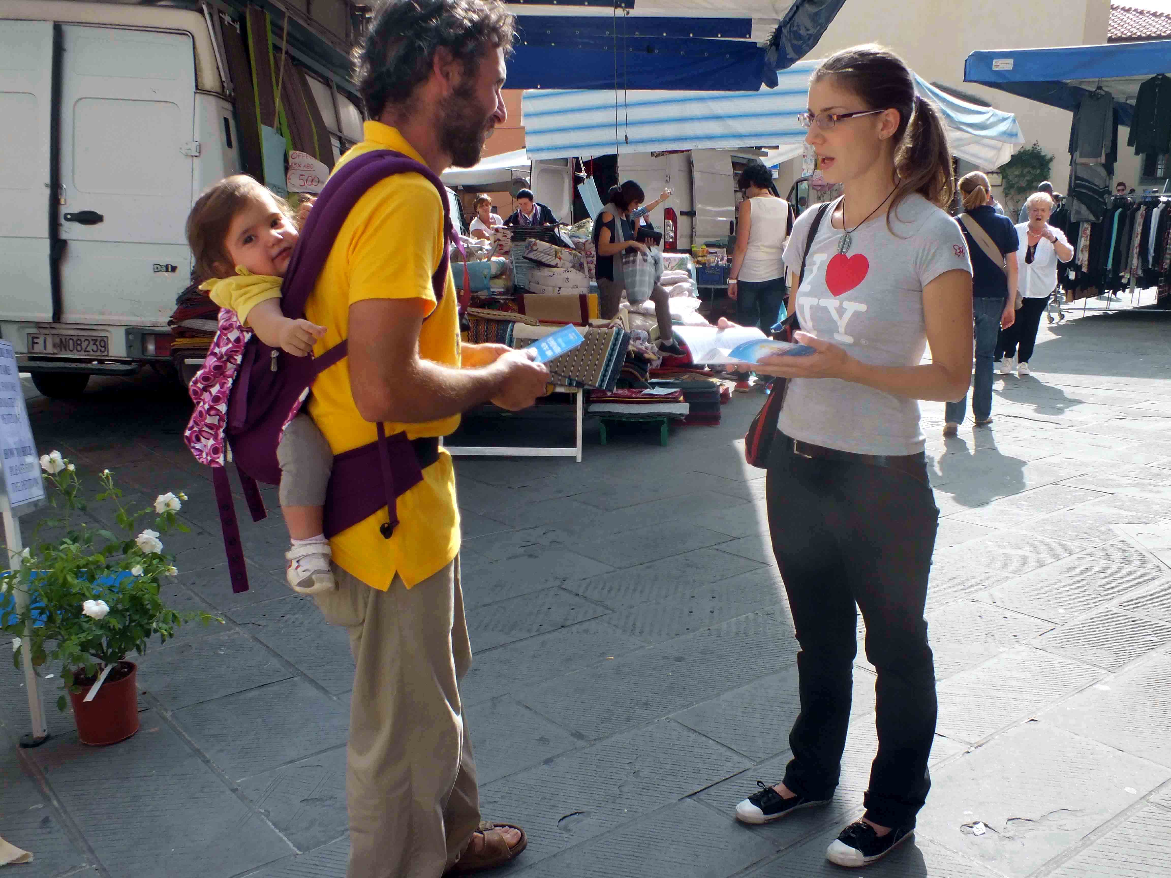 【明慧网二零一四年九月二十六日】近期,意大利多个大城市佛罗伦萨、米兰和罗马的法轮功学员在利用周末举行各种活动,针对社区的意大利民众和旅游景点的中外游客,传播法轮大法的美好,让人们了解中国大陆发生的迫害真相,呼吁制止中共迫害。 图1-6:法轮功学员们在佛罗伦萨的雷杰洛市的年度展会上讲真相 |