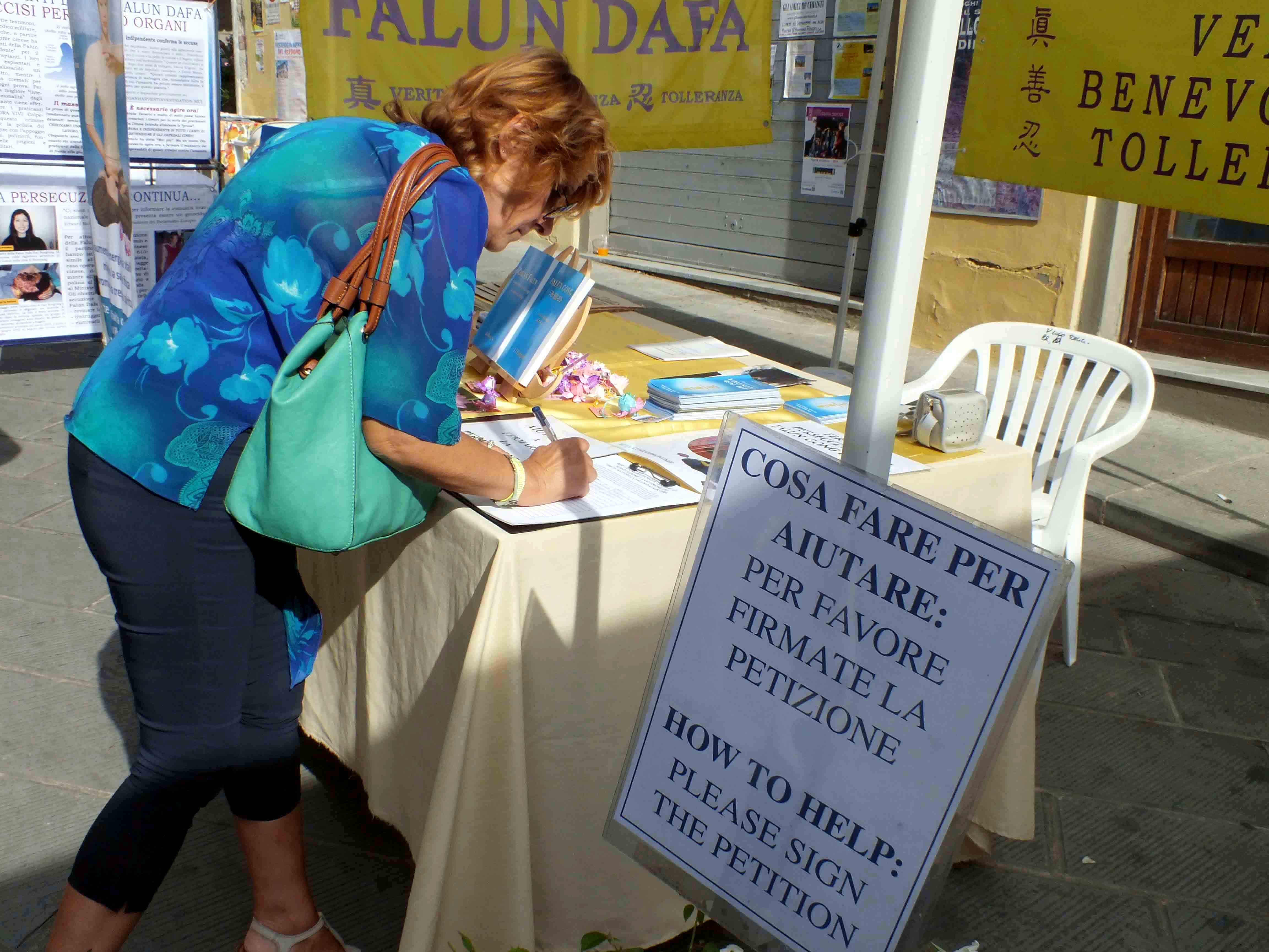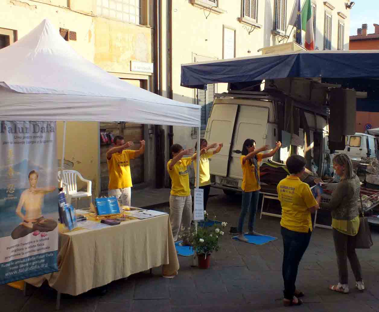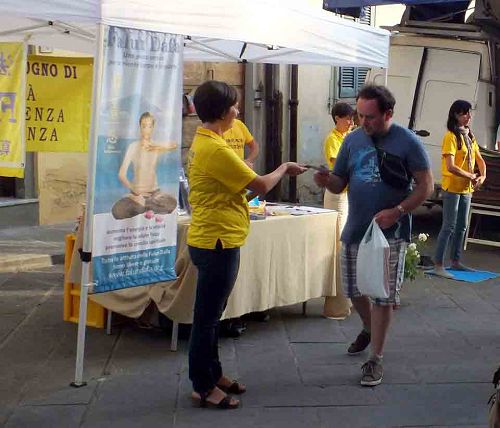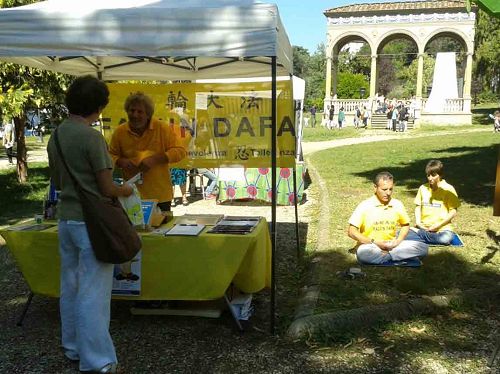 罗马:在古竞技场遗址讲真相 二零一四年八月三十一日,部份意大利法轮功学员在罗马著名的古竞技场遗址举办活动,向民众揭露法轮功学员遭受迫害的真相。活动一开始就引起民众的极大兴趣。学员平和,流畅的炼功动作吸引了人们关注的目光。很多人停下脚步观看,接过真相资料。一些在看台上,比较靠近学员的人们惊叹道:“这正是一条修炼的大道啊!” 当地巡逻值勤的警察也表示了他们的支持和声援,他们拿了真相资料,并听取学员讲述修炼后所带来的身心受益的亲身经历。很多人听学员讲真相后,都很快意识到中共迫害法轮功的暴行。许多人都表示震惊迫害仍在继续。一位先生长时间的仔细阅读真相资料,并用手机给通话对方读了所有的真相内容。许多游客和意大利人驻足,与法轮功学员交谈,谴责中共迫害法轮功的罪行。一些女孩看到展板后,坐下来认真看完真相内容。 几个中国年轻人两次经过展板,然后停下来拍下真相内容。另一位中国女孩上前取走一些真相资料,然后拍照。有些中国人很惊讶地看到法轮功学员正在和平公开的炼功,充分享有言论和信仰的自由。 佛罗伦萨:在“儿童与大自然”节日传播真相 二零一四年九月八日,法轮功学员们来到佛罗伦萨的雷杰洛市(Reggello),在当地的年度展会上讲真相。人们驻足和学员交谈,了解了真相的民众纷纷签名支持法轮功反迫害。  图7-9: 法轮功学员在佛罗伦萨“儿童与大自然”文化节传播大法美好 |