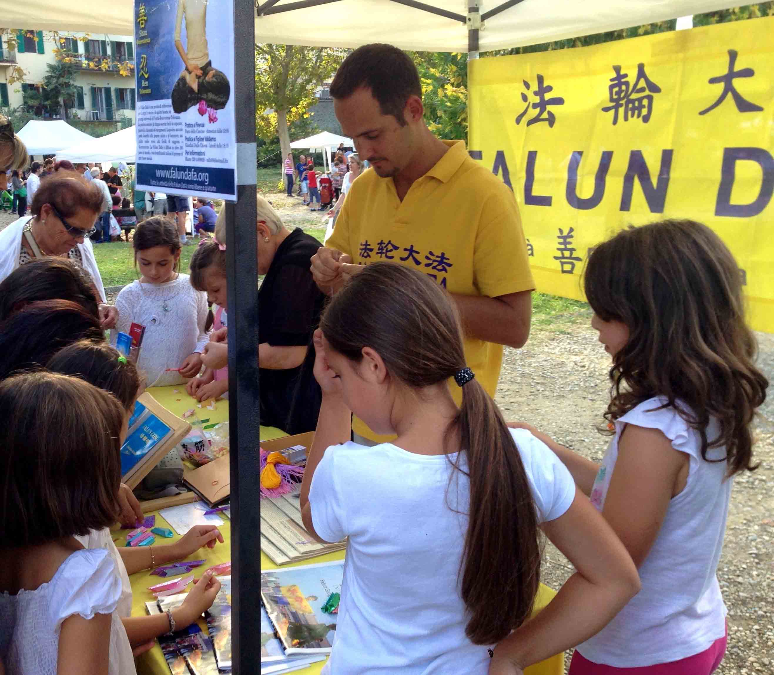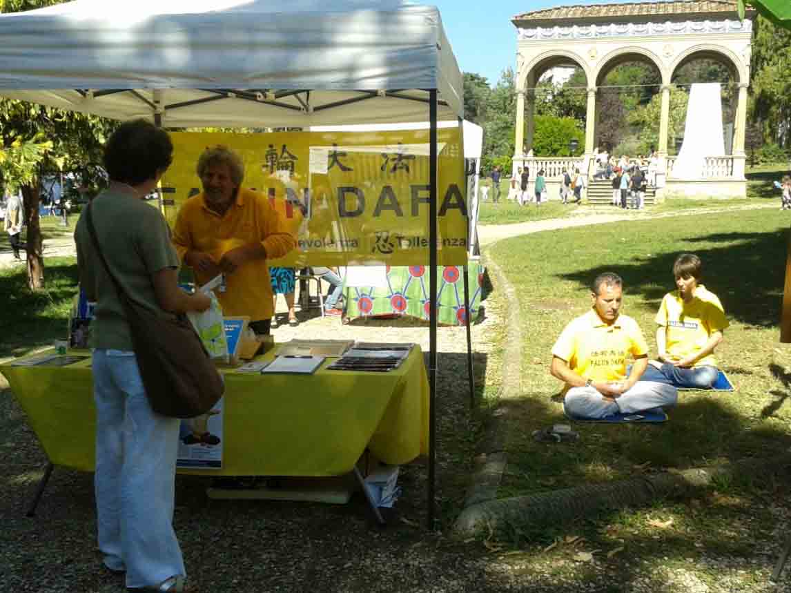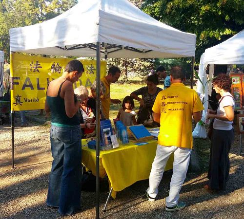 九月十三日和十四日,是佛罗伦萨每年一次的由市政府和儿童与环保健康发展组织主办的“儿童与大自然”的文化节,当地法轮功学员应主办方的邀请参加了活动。上百个家庭带着他们的孩子陆续前来,参加了为期两天的活动。当地法轮功学员展示了功法,并教小孩叠纸莲花。 很多人说他们已经在佛罗伦萨的炼功点看到了学员炼功,藉此机会更听到学员讲述修炼后在日常生活中身心受益,道德提升的经历,同时了解在中国大陆发生的中共对法轮功的迫害真相。自一九九九年以来,中共政权一直在延续镇压法轮功的政策,造成数千人死亡,数万人失踪。主办方的一些成员和前来参加活动的部份家庭与法轮功学员交谈,他们都邀请学员,以后在其他的活动推广功法,传播更多地反迫害真相。 米兰:在社区传播大法真相 九月七日周日,米兰学员应邀参加了社区举办的一个节日活动。该节日由多个文化协会的志愿者主办。 学员设立了一个信息点,放置真相展板与法轮功真相资料,让人们可以看到在中国大陆中共迫害法轮功的事实图片和信息。从早上开始,法轮功学员不间断的,轮流演示法轮功功法。很多从其他城市来的人都好奇的驻足观看学员炼功,阅读真相展板。因此,学员向人们解释为什么这样一个和平的做法,在中国大陆被残酷迫害十五年。 人们都在请愿书上签名表示支持法轮功,呼吁停止迫害。很多人表示打算学功,并询问在哪里可以学炼功法。