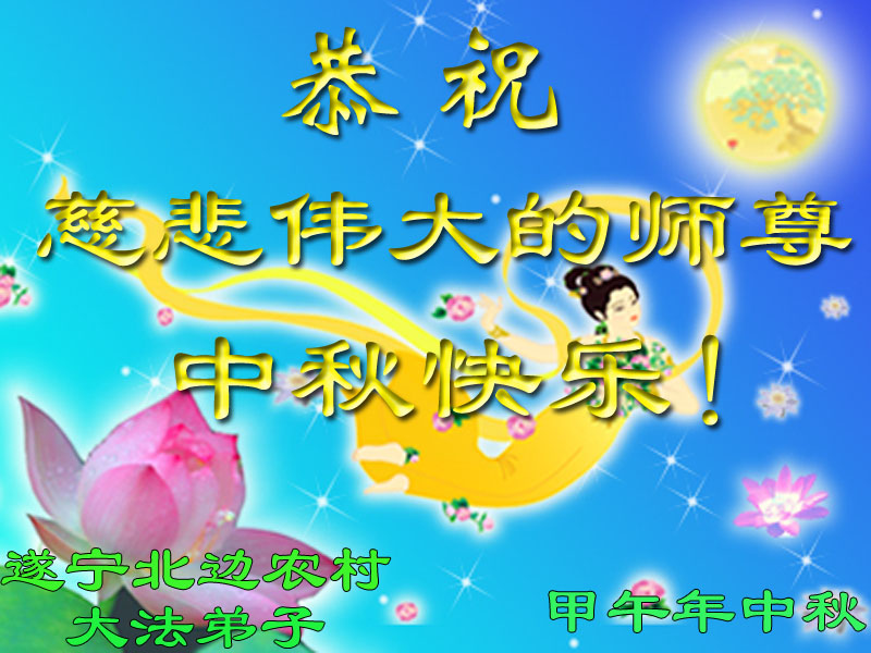 在传统佳节中秋来临之际,我们阳泉市一农村学法小组的全体学员叩拜师父!向伟大慈悲的师父问一声:辛苦了!谢谢您! 四川省遂宁北边农村大法弟子恭祝慈悲伟大的师尊中秋快乐!