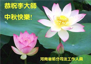 尊敬的李大师您好!我们衷心感谢您对我们的慈悲救度! 人间不是中共邪*党-逞凶的乐园,中共依靠谎言与暴力掠夺残杀民众的血腥历史一定会被神清算的! 请李大师放心,我们一定将中共恶党的暴行曝光于天下,让更多的世人看清中共的邪恶本质及险恶用心,远离邪*党-,给自己及家人选择一个美好的未来! 河南省部份司法工作人员恭祝慈悲伟大的李大师中秋快乐!