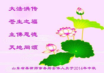 我们万分感谢李大师对我们的慈悲救度!十几年来,众多的世人通过大法弟子坚持不懈的努力明白了真相,退出了中共邪*党-;有的公检法人员明白真相后停止了对法轮功的迫害,利用自己的便利条件保护大法学员。 我们真心希望更多的中国人能够看清形势,明白真相,抓紧时机自救,顺应天意,退出邪*党-,选择美好的未来! 山东某律师事务所全体人员恭祝慈悲伟大的李大师中秋快乐!