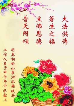 我们衷心感谢李大师对我们的救度大恩! 上天有好生之德,秉承李大师旨意的法轮功学员在无名的残酷迫害中在讲真相救人,唤醒世人的正念与良知,告诉世人真实的法轮功,告诉世人中共的真实面目和险恶用心,同时把“天灭中共”的天机告诉人们,只有“三:退.”(退出中共的党、团、队组织)才能保平安! 有很多世人明白了真相,他们都从内心感恩慈悲伟大的李大师! 明真相的山东泗水县政府工作人员恭祝慈悲伟大的李大师中秋快乐!