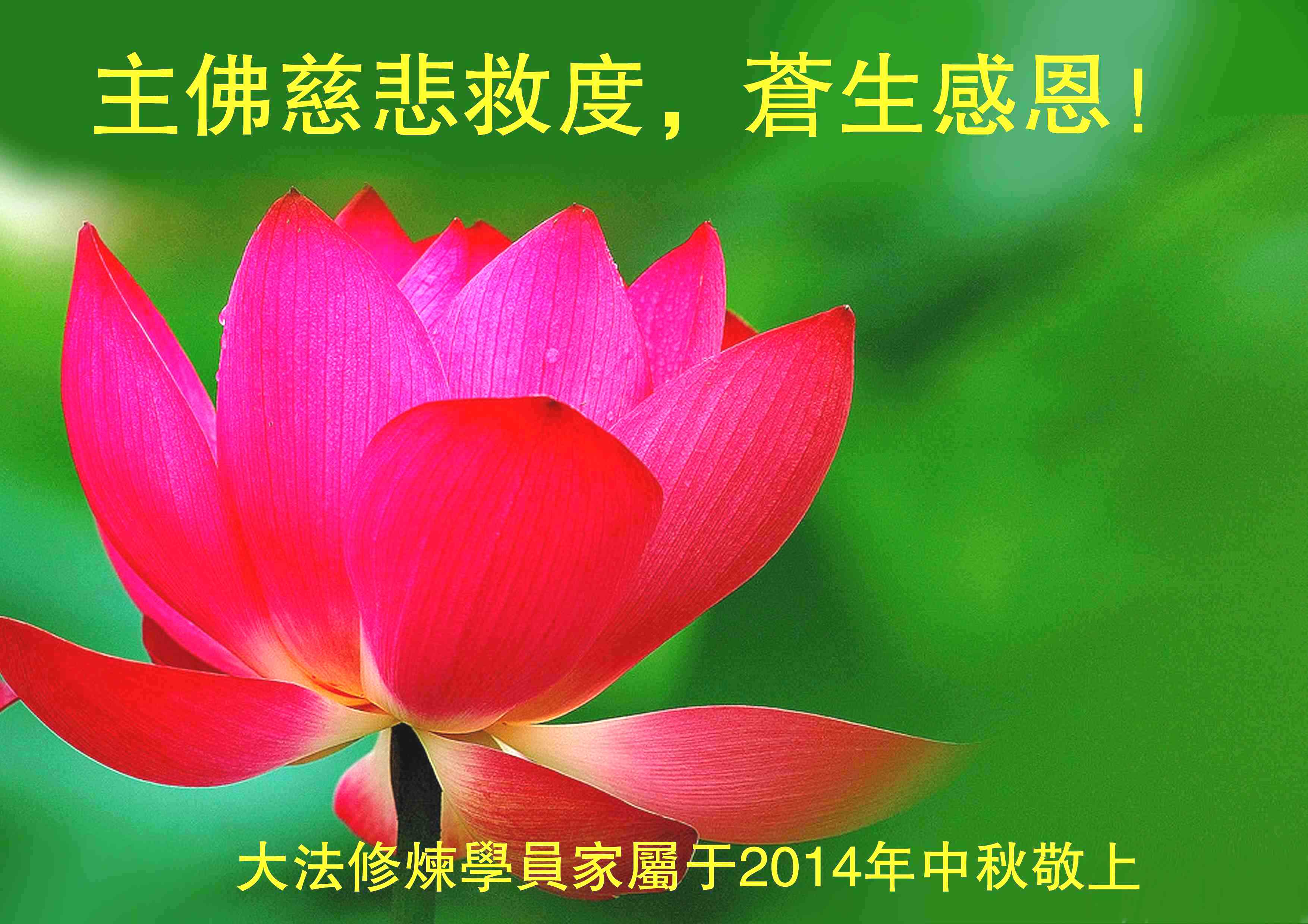 尊敬的李大师中秋节好! “海上生明月,天涯共此时。每逢佳节倍思亲。”在这中华民族传统的中秋佳节即将来临之际,我们全家人向尊敬的李大师祝贺,祝您及您的家人中秋节快乐!万事如意! 我们盼望大师早日回来,与可贵的中国人团聚,我们好人一定会等到那一天的到来,一定会的! 法轮大法洪传世界,福泽苍生,我们全家人受益匪浅,生活幸福,身体健康,感谢大师的慈悲护佑! “法轮大法好!真、善、忍好!李大师好!”我们永远铭刻在心。 衷心感谢我们无限敬仰的李大师! 山东省荣成市大法弟子的家人敬上 2014年9月2日 山东省德州市平原县一个常人祝大师中秋快乐!