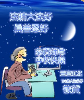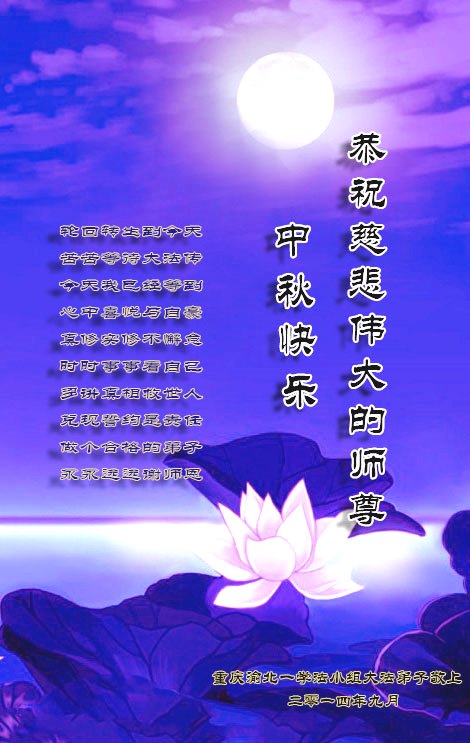 中秋月圆夜色美 法徒翘首盼师归 修炼如初再精進 法正人间随师回 二零一四年九月二日 重庆江北大石坝一老年大法弟子恭祝慈悲伟大的师父中秋节快乐!