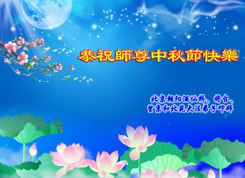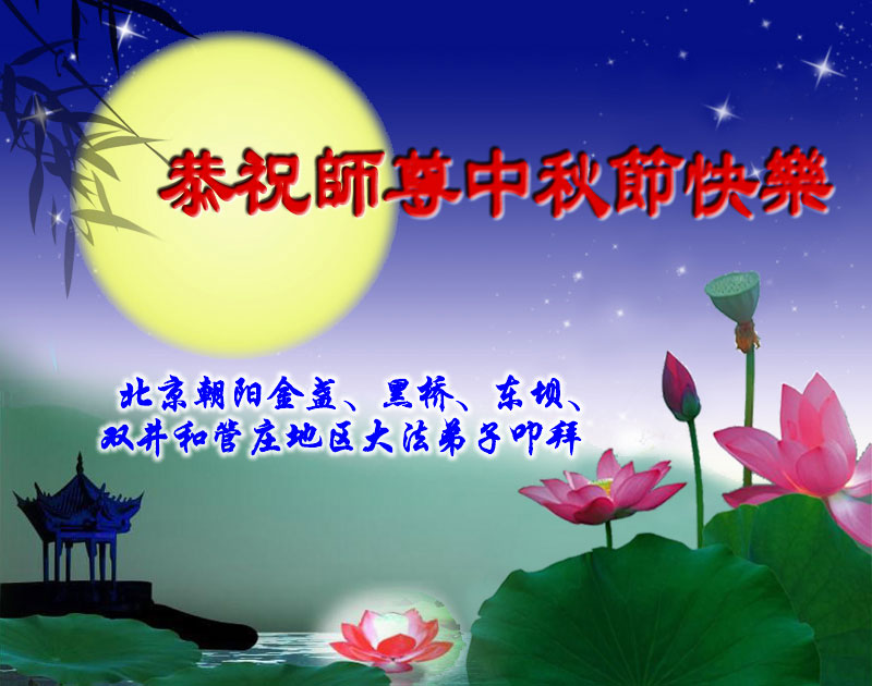 我们向慈悲伟大的师尊问好!大法弟子非常想念师尊,向师尊合十叩拜! 北京朝阳金盏地区、黑桥地区、东坝地区、双井地区和管庄地区大法弟子恭祝师尊中秋节快乐!