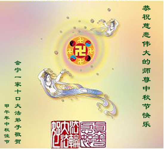 师父好!师父辛苦了! 每逢佳节倍思亲, 在这中秋佳节, 我们一家十口大法弟子向师父问好!师父您辛苦了! 师尊啊, 蘸尽苍宇之水写不尽您的洪恩, 大法救度无量苍生, 师恩浩大穹。 唯有精進,再精進, 让师尊少操一份心, 多一份欣慰, 请师尊放心, 弟子们一定做好三件事, 多救人, 圆满随师还。 会宁一家十口大法弟子跪拜 大法弟子恭祝慈悲伟大的师尊中秋节快乐!