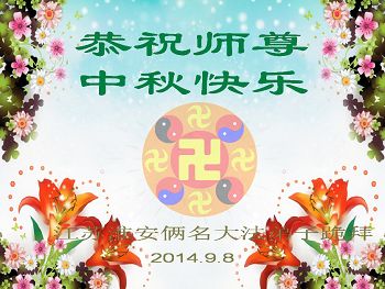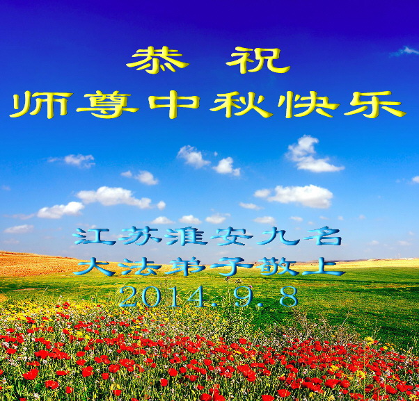师父正法,洪恩浩荡,圣恩难报,感恩师父对我们的慈悲苦度!感恩师父为我们无量的承受! 我们唯有精進,做到修炼如初,紧跟师父走好正法最后之路,在助师正法救度众生的最后时刻,弟子们谨记师尊教诲,学好法,以法为师,事事“向内找”,修好自己,整体配合好,以强大的正念形成圆容不破的整体,抓紧救人,多救人,完成我们的历史大任,兑现史前誓约,不辜负师父对我们的慈悲救度。圆满随师还! 江苏常州全体大法弟子叩拜敬上 2014年9月7日 黑龙江宝泉岭大法弟子恭祝师尊甲午中秋快乐!