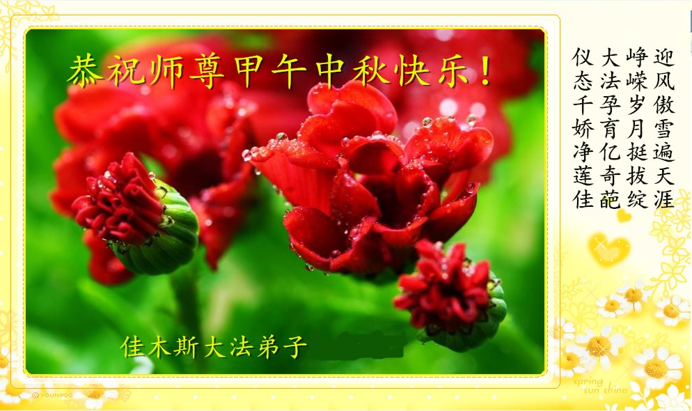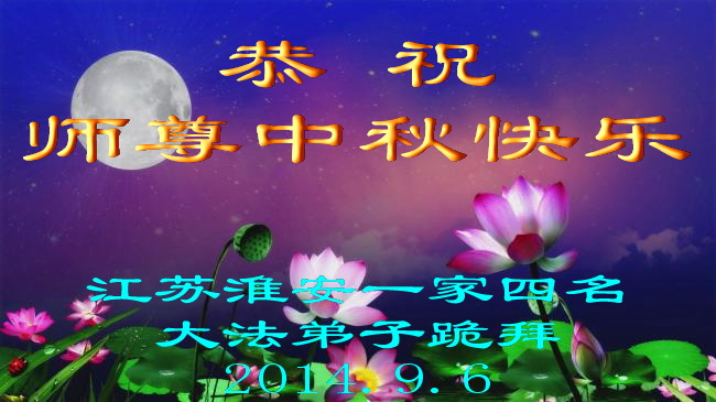 我代表全家人向慈悲伟大的师尊问好!师父辛苦了!弟子无法用语言来表达师父对弟子的慈悲呵护,师父把我们从地狱捞起洗净,弟子唯有听师父的话,学好法,做好三件事,勇猛精進,跟师父回家。 江苏镇江全体大法弟子恭祝师尊中秋节快乐!
