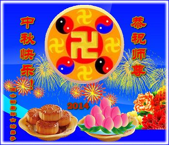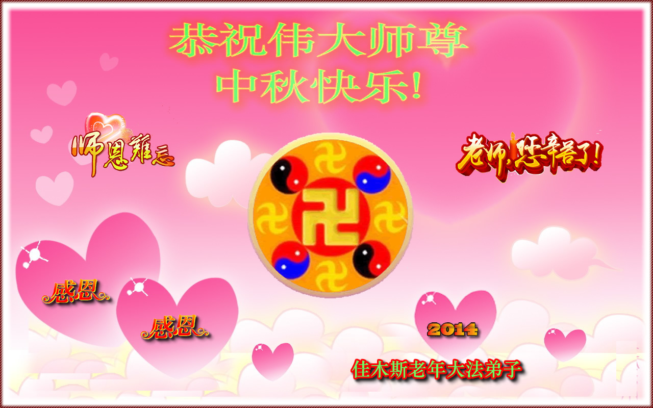 年年快乐中秋, 月月精進实修, 日日谢师叩首。 时时众生得救, 刻刻人心不留。 分分携手同修, 秒秒紧跟师走。 佳木斯大法弟子 2014 中秋 山东潍坊一学法小组大法弟子恭祝师尊中秋节快乐!