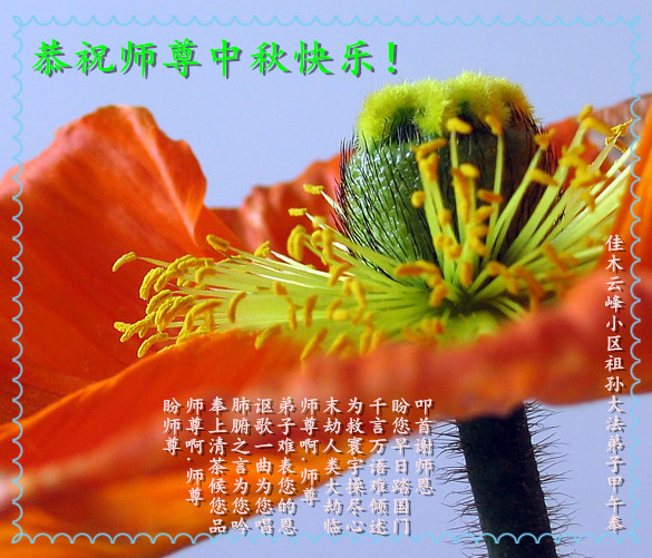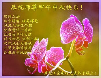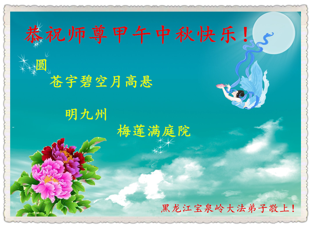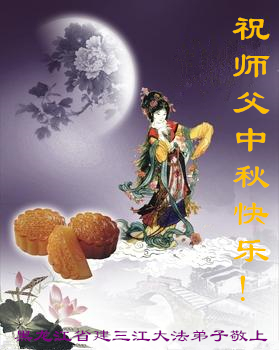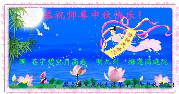 祝师父中秋快乐!弟子想念师父,无法用语言表达对师父的思念,愿小小的贺卡带去弟子的祝愿,再次祝师父中秋快乐!这个节日是团圆的日子,我相信和师父在一起团圆的日子越来越近了!黑龙江建三江大法弟子敬上 黑龙江佳木斯大法弟子恭祝伟大师尊中秋快乐!