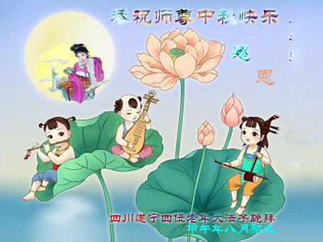 中秋佳节到 弟子问师好 祝师尊快乐 感师苦救度 弟子得法往回修 牢记肩负责任 学法修心性 遇事向内找 助师正法不怕苦 不管刮风下雨 冰天雪地 走街串巷上高梯 送真相多救人 兑现史前誓约 唯愿师尊笑 四川遂宁四位老年大法弟子叩拜 恭祝师尊中秋快乐! 四川遂宁一学法组全体大法弟子恭祝师尊中秋快乐!