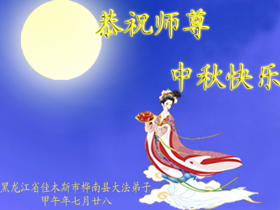 中秋佳节即将来临,我代表我们全家祝福慈悲伟大的师尊中秋节快乐! 在正法的最后时刻,我们要抓紧有限的时间,在学好法修好自己的基础上,多救众生,珍惜这万古机缘,不能懈怠,不辜负师尊的苦心救度。 佳木斯在大法中受益的全家 二零一四年九月三日 黑龙江佳木斯大法弟子恭祝慈悲伟大的师尊中秋节快乐!