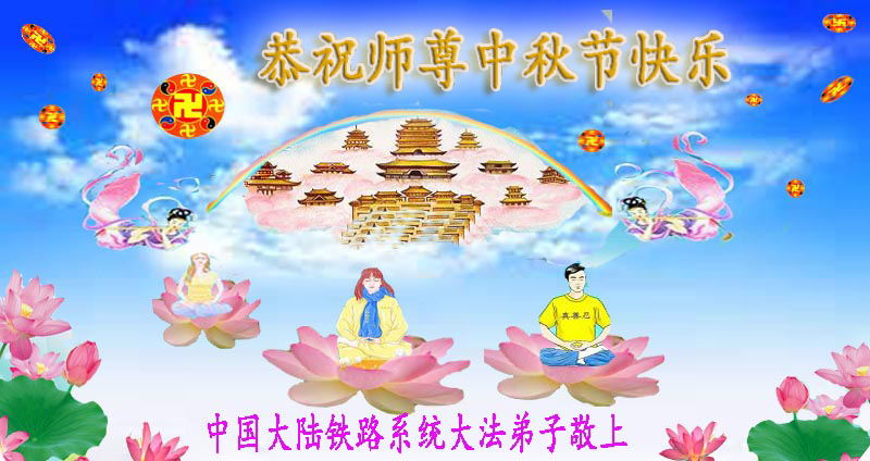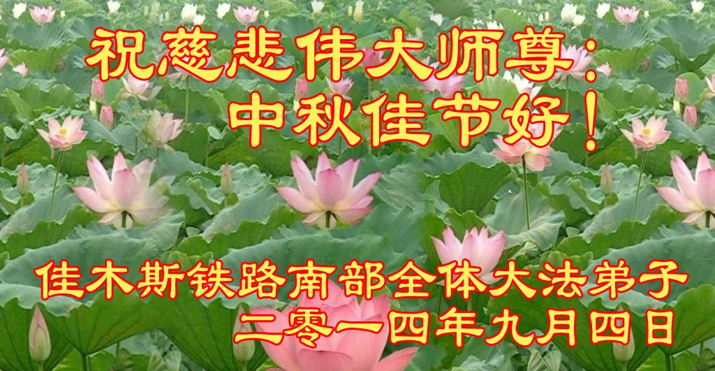 值此二零一四年中秋佳节即将到来之际,中国大陆铁路系统全体大法弟子恭祝至尊至上慈悲伟大的师尊中秋节快乐! 师尊无量慈悲,为宇宙众生的得度承受巨大,为大法弟子的成长操劳辛苦,我们对师尊的感恩无以言表,深知师尊与众生对我们的厚望,深感自己的责任重大,唯有紧跟师尊走好最后的路,尽全力做好三件事,救度更多众生,圆满随师还。 中国大陆铁路系统大法弟子合十跪拜 四川省达州市开江县卫生系统一大法弟子恭祝师父中秋快乐!