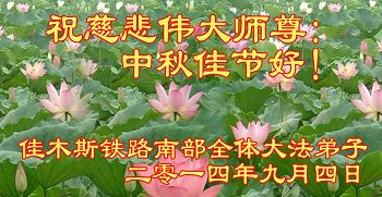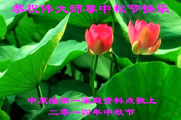 中秋佳节倍思亲,师尊您辛苦了,您为我们大法弟子和众生操尽了心,我们无法用语言来报答,弟子们只有按照师尊的要求,整体提高,整体升华,转变观念,去掉各种人心执着,多救人,让师尊少一份操劳,多一份安慰。 佳木斯铁路南部全体大法弟子 二零一四年九月四日 中原油田全体项目组全体大法弟子恭祝师父中秋节快乐!