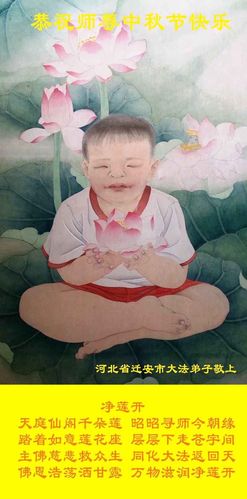 遥问恩师佳节好 月儿明 清辉照 遥问恩师佳节好 莲花俏 展娇娆 弟子内修品德高。 三:退.潮 洪势高 众醒三:退.劫难逃。 恩师慈 佛光照 勇猛精進上九霄。 洪福赐 大法好 登上法舟神佛笑。 河北省唐山市滦县一学法小组大法弟子恭祝师尊中秋节快乐!