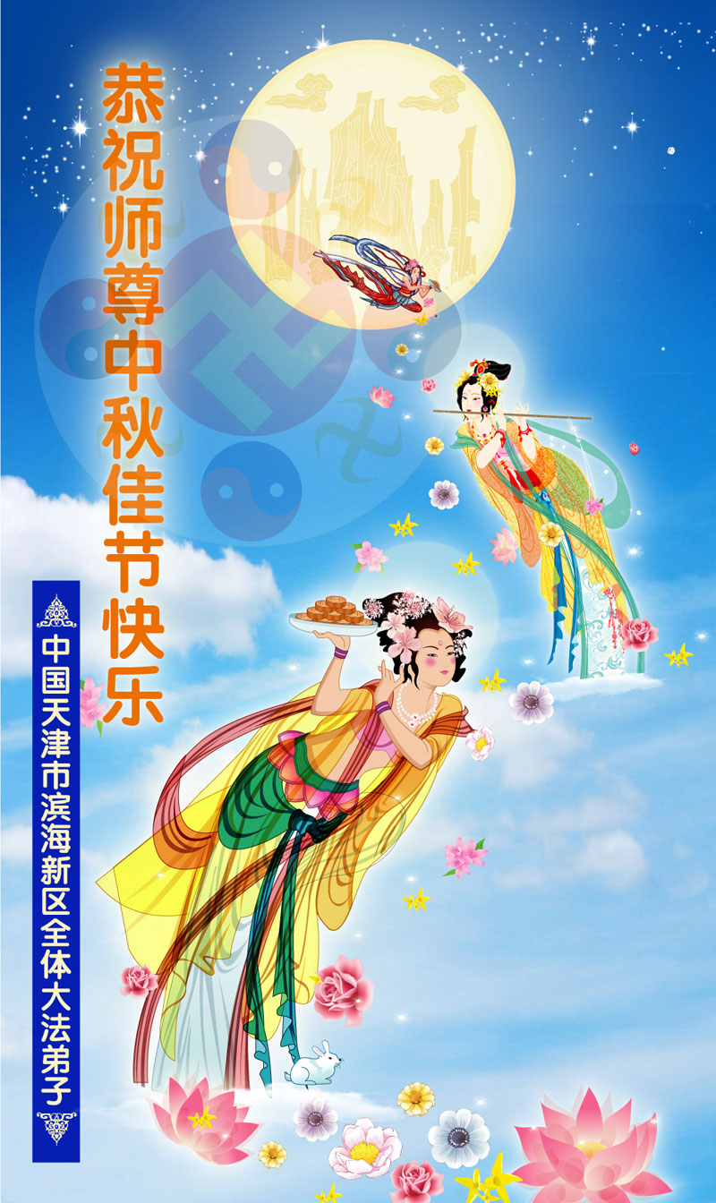 师尊好! 在这花好月圆之夜,我们想念师尊盼望您早日回国与大法弟子团圆,共度佳节! 天津红桥、北辰大法弟子 2014.9.4 天津市津南区大法弟子祝伟大的师尊中秋快乐!