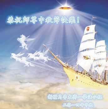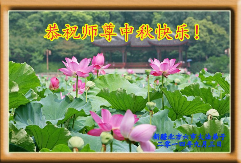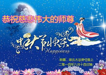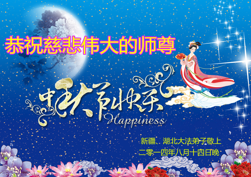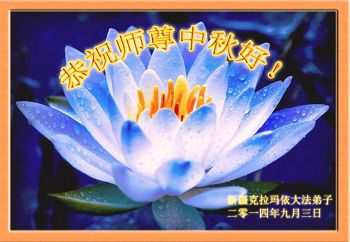 2014年的中秋到来之际,我们一家祝贺慈悲伟大的师父中秋快乐! 我们要跟上师父的正法進程,修好自己,做好三件事,跟师父回家。 新疆喀什被迫流离失所14年大法弟子敬上 2014年9月7日 新疆克拉玛依全体大法弟子恭祝伟大的师父中秋节好!