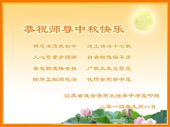 我们一定听师父的话,学好法,修好自己,多救人。在修炼的路上,一定冲破重重阻力, 过好关和难。跟上师父正法進程, 完成史前誓愿, 圆满随师回家。 江苏省张家港大法弟子敬上 二零一四年九月二日 江苏省淮安市身陷囹圄的大法弟子恭祝师尊中秋快乐!