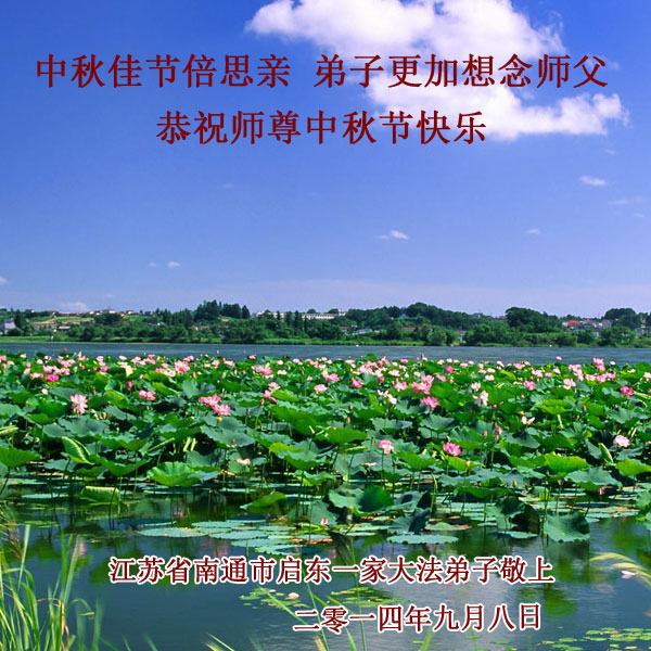 师父您好!弟子们决心振作精神,精進起来,认真学好法、做好三件事,兑现史前大愿,跟师父回家! 二零一四年 九月四日 江苏省南通市启东一家大法弟子恭祝师尊中秋节快乐!