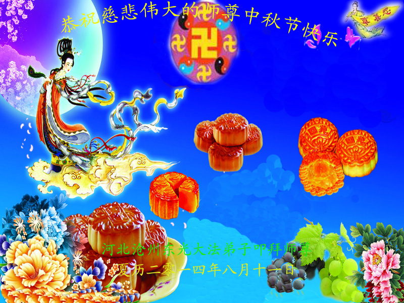 合十 河北省巨鹿县全体大法弟子敬上 2014.9.3 河北省昌黎一学法组大法弟子祝贺伟大师父中秋节快乐!