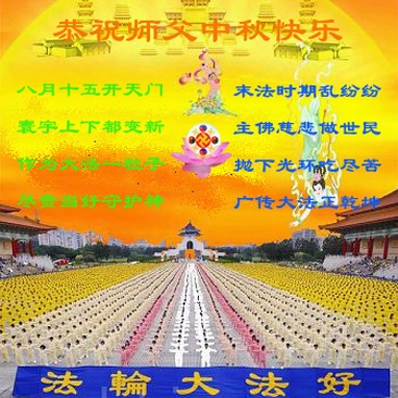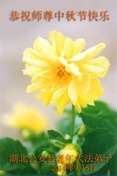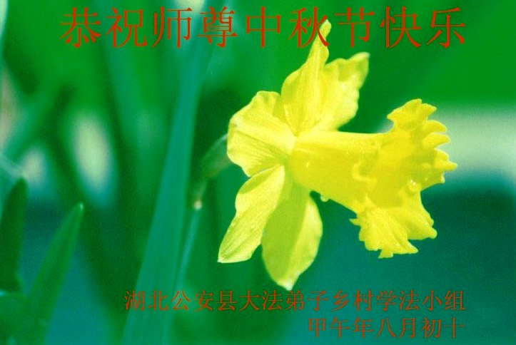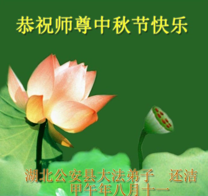 师父您好!我们天门市大法资料点的弟子一直铭记师父的教诲,从邪恶疯狂的迫害开始一直到现在都没有间断过的做真相资料,其间风风雨雨、摔摔打打,在实修中不断走向成熟,是在伟大的师父呵护下走过来的,在此传统佳节来临之际,恭祝师父中秋节快乐,谢谢师父的慈悲救度! 湖北省天门市资料点全体大法弟子拜谢! 湖北省荆州市公安县大法弟子一学组恭祝师尊中秋节快乐!