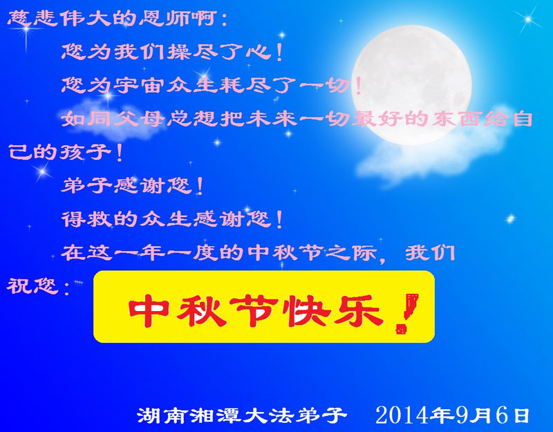 【明慧网二零一四年九月八日】 岳阳大法弟子恭祝师尊中秋节快乐!