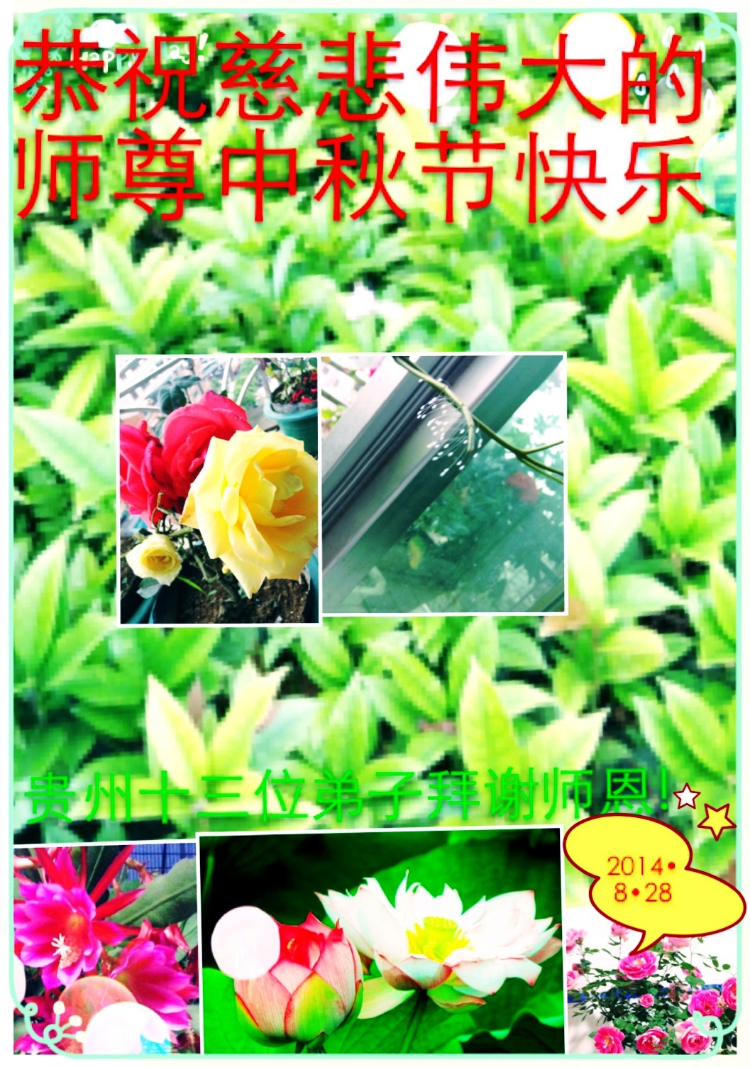师父: 一年一度的中国传统节日—中秋节又到了,弟子们想念师父! 在正法即将结束的最后日子里,弟子们一定打破旧势力造成的间隔,形成整体,努力做好三件事,圆满随师还! 贵州省黔东南苗族侗族自治州全体大法弟子敬贺! 阴历2014年8月15日 贵州省贵阳大法弟子恭祝慈悲伟大的师尊中秋节快乐!
