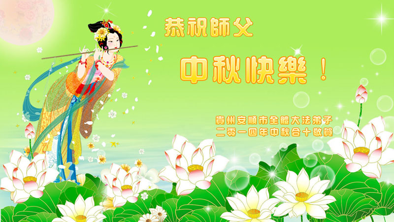 慈悲伟大的师尊:我们贵阳大法弟子恭祝师尊中秋快乐! 我们企盼着叩见师尊。每当这月圆之日更加思念师尊!朗朗明月请鉴我们紧随师尊之志! 贵阳大法弟子 2014-9-7 贵州六盘水大法弟子恭祝师父中秋快乐!