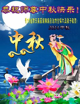 慈悲伟大的师父:中秋节好! 中秋节即将到来,我们很想念师父,我们虽未见过师父的面,但师父却无时无刻都在看护着弟子,把宇宙中最荣耀的给了弟子,我们无以回报,只有精進再精進,努力做好三件事,助师正法,救度更多众生,随师回家。 贵州六盘水大法弟子 二零一四年九月七日 贵州餐饮业大法弟子敬祝师尊中秋快乐!