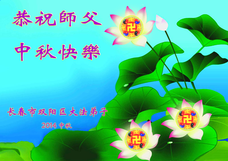 得法修炼二十载, 真得正果需变念。 恩师慈悲洒甘露, 觉醒众生得生还。 在二零一四年中秋佳节到来之际,大法弟子祝师父中秋快乐!师父您辛苦了! 长春一大法弟子 二零一四年九月二日 吉林省长春市九台市地区全体大法弟子向慈悲伟大的师尊恭祝中秋快乐!